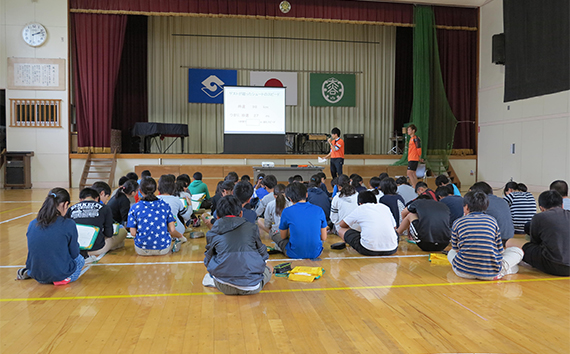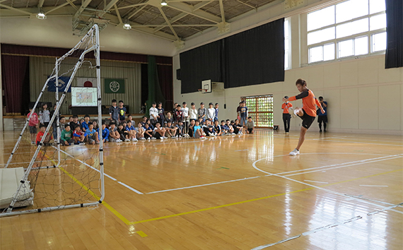 今回は同校6年生の児童54人が対象。授業ではまず「みはじ」を学習し、飯田選手が蹴ったシュートの速度をスピードガンで使って計測しました。計測された速度から、PKの場合にシュートがゴールに達するまでのわずかな時間を「みはじ」計算で導きだしました。勢いよく放たれたシュートには児童たちからは驚きの声も。また試合中におけるボール支配率など、サッカーを通じて算数を学習しました。