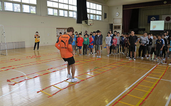 学習の後は、飯田選手指導のもと、ラダーを使ったトレーニングを体験。やさしいステップから始まり、だんだんと難しくなっていくトレーニングにも児童たちは一生懸命に取り組んでいました。