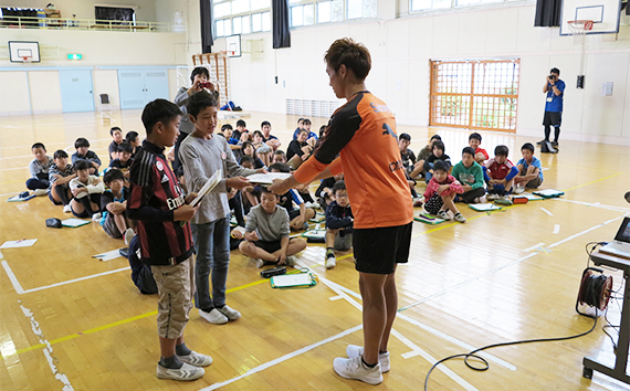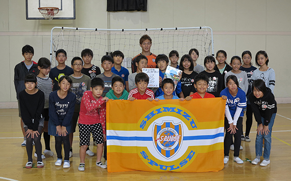 最後に飯田選手から「小さなころからプロサッカー選手になることが夢でした。今、夢がかなってサッカーをしていることが幸せです。十年後皆さんの誰かがJリーガーになり一緒にサッカーが出来るようにお互い頑張りましょう!」とメッセージを贈り、各クラスにサイン色紙とクリアファイルを贈呈しました。また、クラスごと記念撮影も行い、大谷小学校でのエスパルスドリーム教室は終了しました。