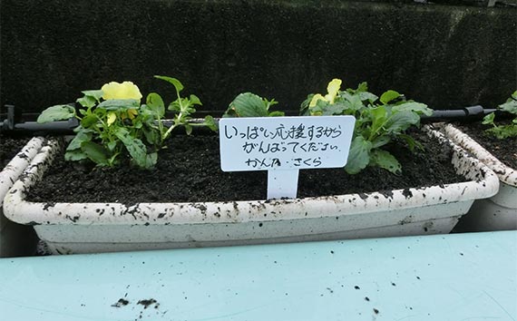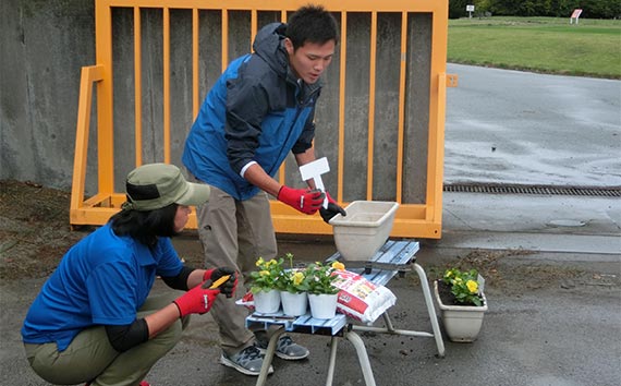 今回も、日頃アイスタ日本平や三保グラウンドのピッチメンテナンスを行う、グリーンマスターズ清水の皆さまのご協力・ご指導のもと、70鉢のプランターにオレンジと黄色のパンジーを植えました。最後にチームや選手への想い、応援メッセージをフラワーラベルに記入し、観客スタンドにプランターを並べて作業は終了しました。
