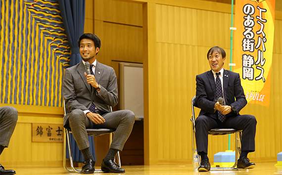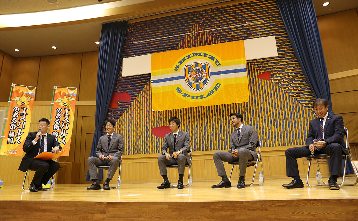 エスパルスの未来について聞かれると犬飼選手は「今は苦しい状況だが、強いエスパルスにならないといけない。みんなが応援してくれるチームにしなければいけないと思う」、斉藤俊秀オフィサーは「エスパルスにはサポーターの強い想いと、歴史がある。オフィサーとして、地域に根ざした仕事を通して、発信していきたい。」、そして市川大祐コーチは、「サッカースクールで子どもたちを指導し、みんなのエスパルスへの思いを感じることができた。杉山浩太選手のように、気持ちが強い選手を育てたい。」とそれぞれ語りました。