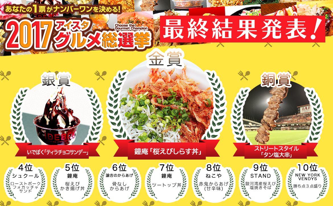 2017シーズン、IAIスタジアム日本平でのホームゲーム開催時に出店した飲食ブース全21店舗のうち18店舗が参加した、2017アイスタグルメのナンバーワンを決める『2017アイスタグルメ総選挙』。9/16川崎戦、 9/23広島戦、11/18札幌戦での激戦を終えました。ご来場の皆様には多くの投票をいただき、ありがとうございました。エスパルス、飲食店共々、厚く御礼申し上げます。