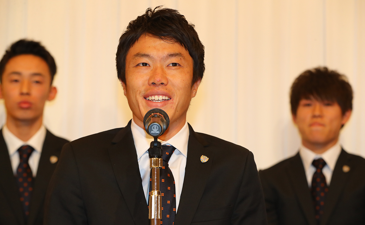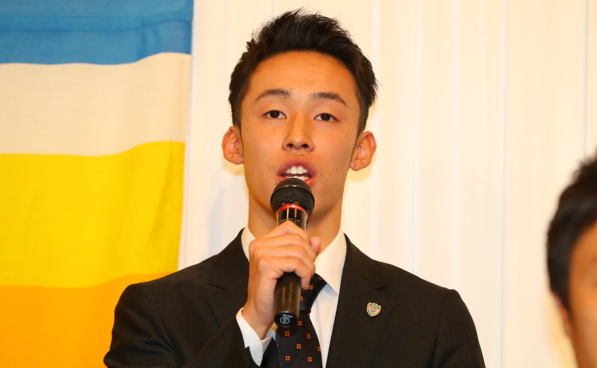 初めまして。流通経済大学から加入します新井栄聡です。オファーを頂いた時から、今日この日を楽しみにしていました。オファーをくれた方々や、今まで支えてくれた方々のために、ピッチでいち早く貢献できるよう、練習から日々頑張っていきます。よろしくお願いします。