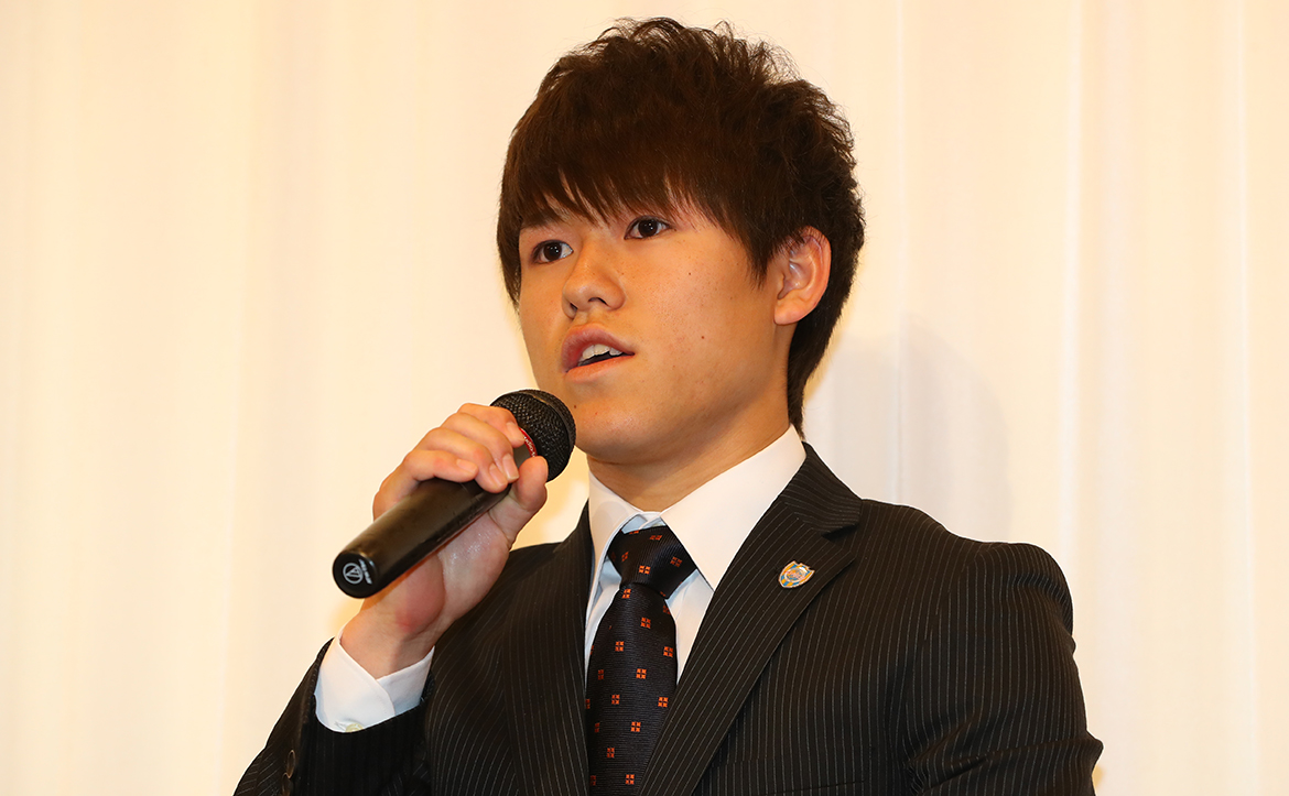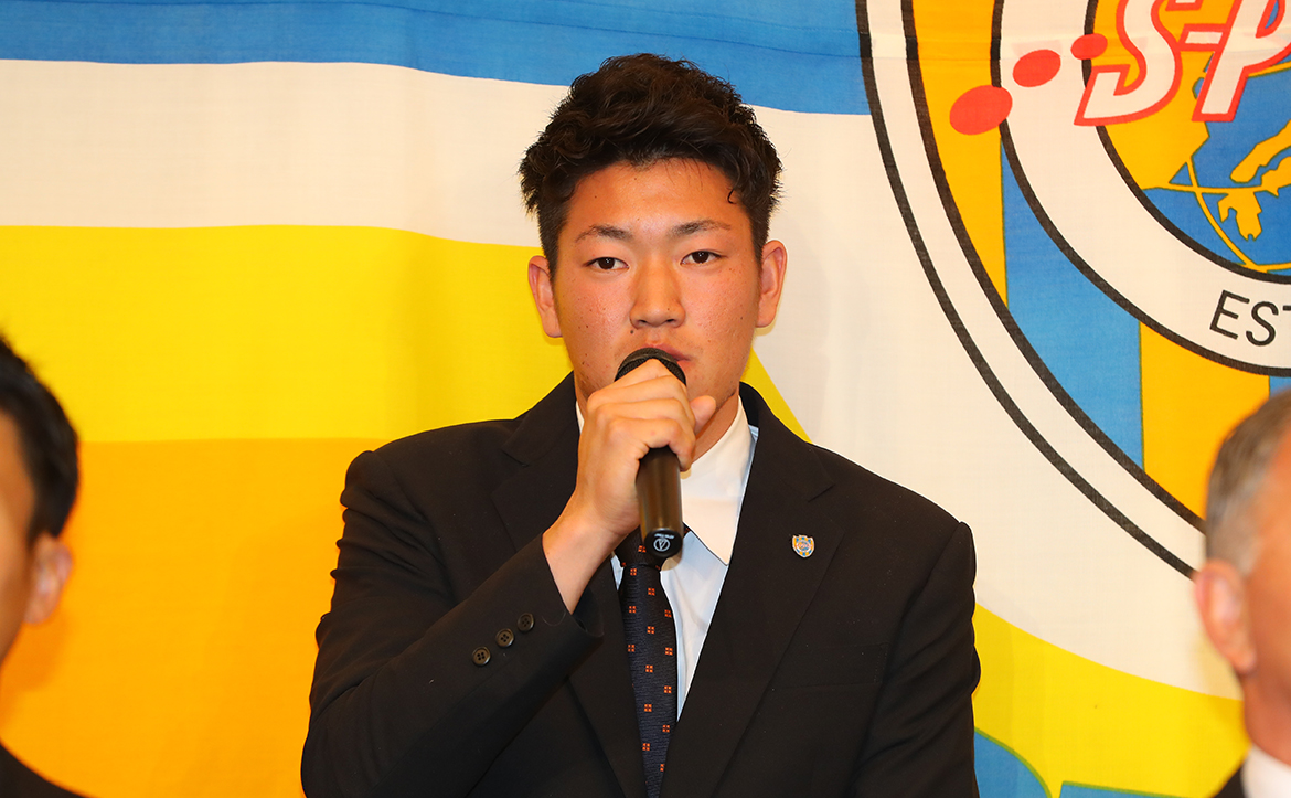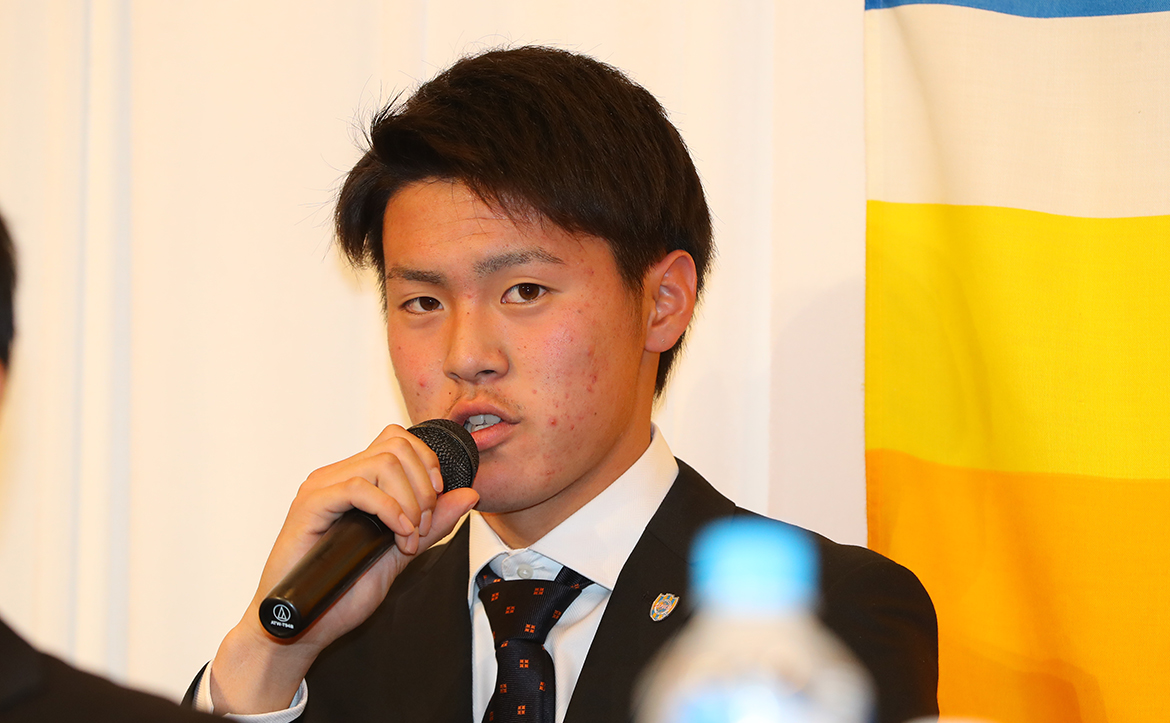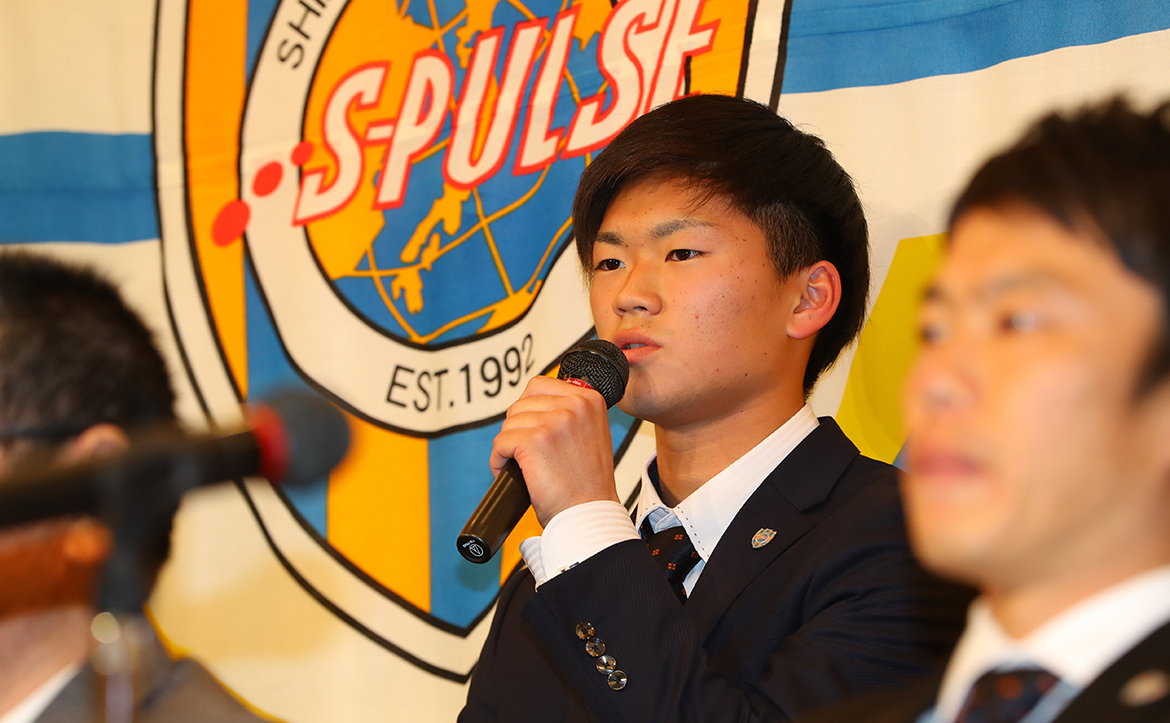 初めまして。神村学園から来ました髙橋大悟です。サッカー選手として、この清水エスパルスでスタートできることを嬉しく思います。一日でも早く試合に出て、恩返しができるように頑張りたいと思います。よろしくお願いします。