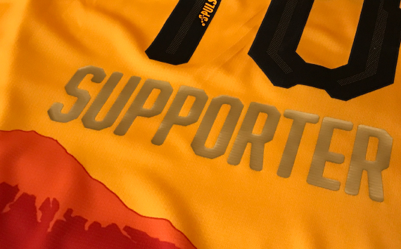 「アパレルフォームストライプ」とクルーネックには、クラブとして初めて発色の良いオレンジ(蛍光色)を採用し、全体として明るい印象のユニフォームに仕上がっています。