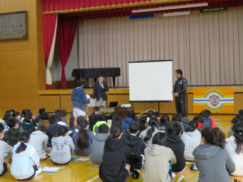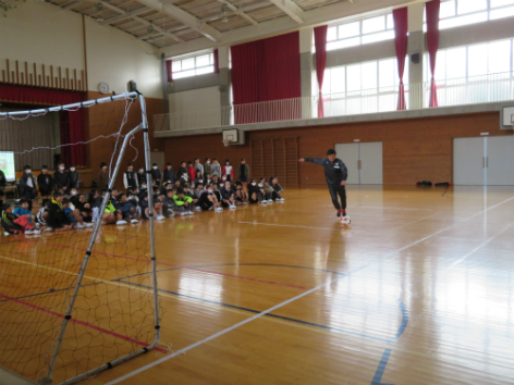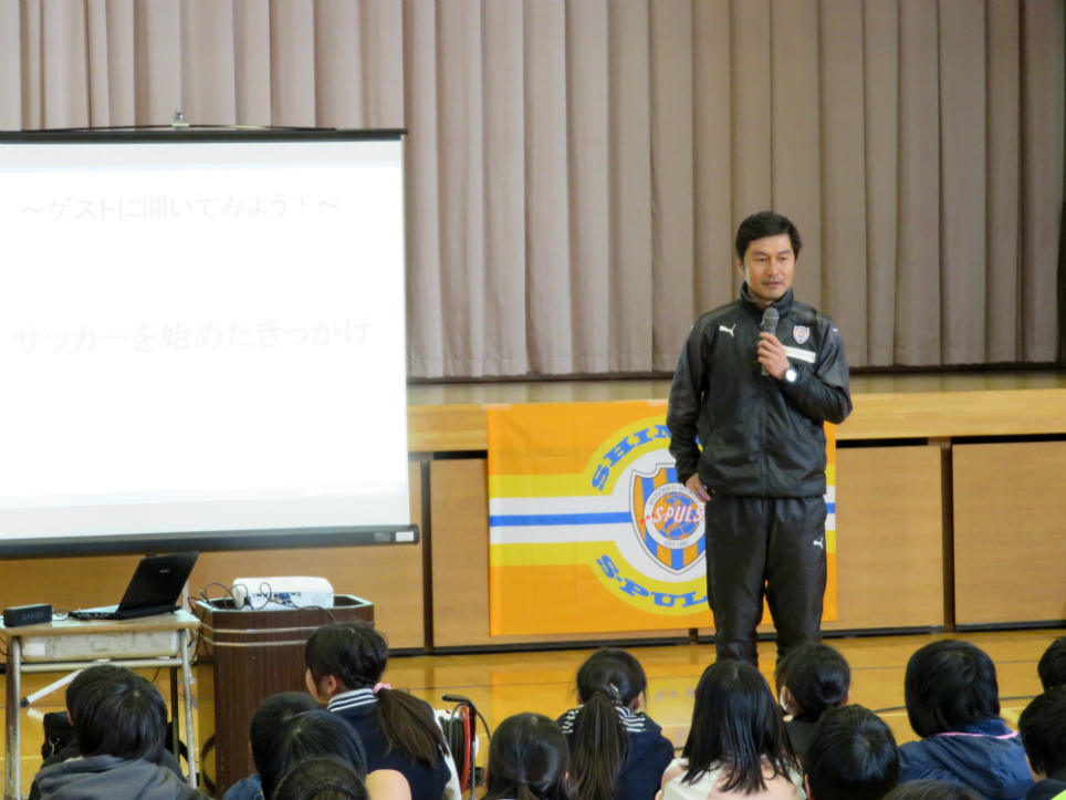 今回は6年生の児童78名を対象として、算数の「速さ」を学習。鈴木U-12監督がシュートを行ない、スピードガンでシュートを計測しました。計測された速度から、PKでゴールキーパーがシュートを止めるための時間を「みはじ」計算で導きだしました。鈴木U-12 監督が放ったシュートの迫力に児童たちからは驚きの声が上がりました。また、試合中におけるボール支配率など、サッカーにも算数が使われることを学びました。