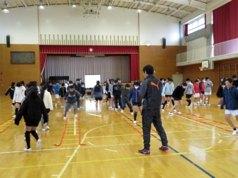 学習の後は、鈴木U-12監督指導のもと、ラダーを使ったトレーニングを体験。やさしいステップから、だんだんと難しくなっていくステップにも、児童たちは熱心に取り組んでいました。