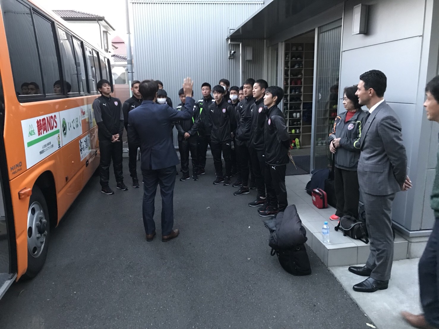 チームは翌日の出発に向け、3月13日18時に大榎GM補佐と育成事業本部 山下部長に見送られ、エスパルス聖一色寮を出発。21時過ぎに成田空港近くのホテルに着き前泊をしました。