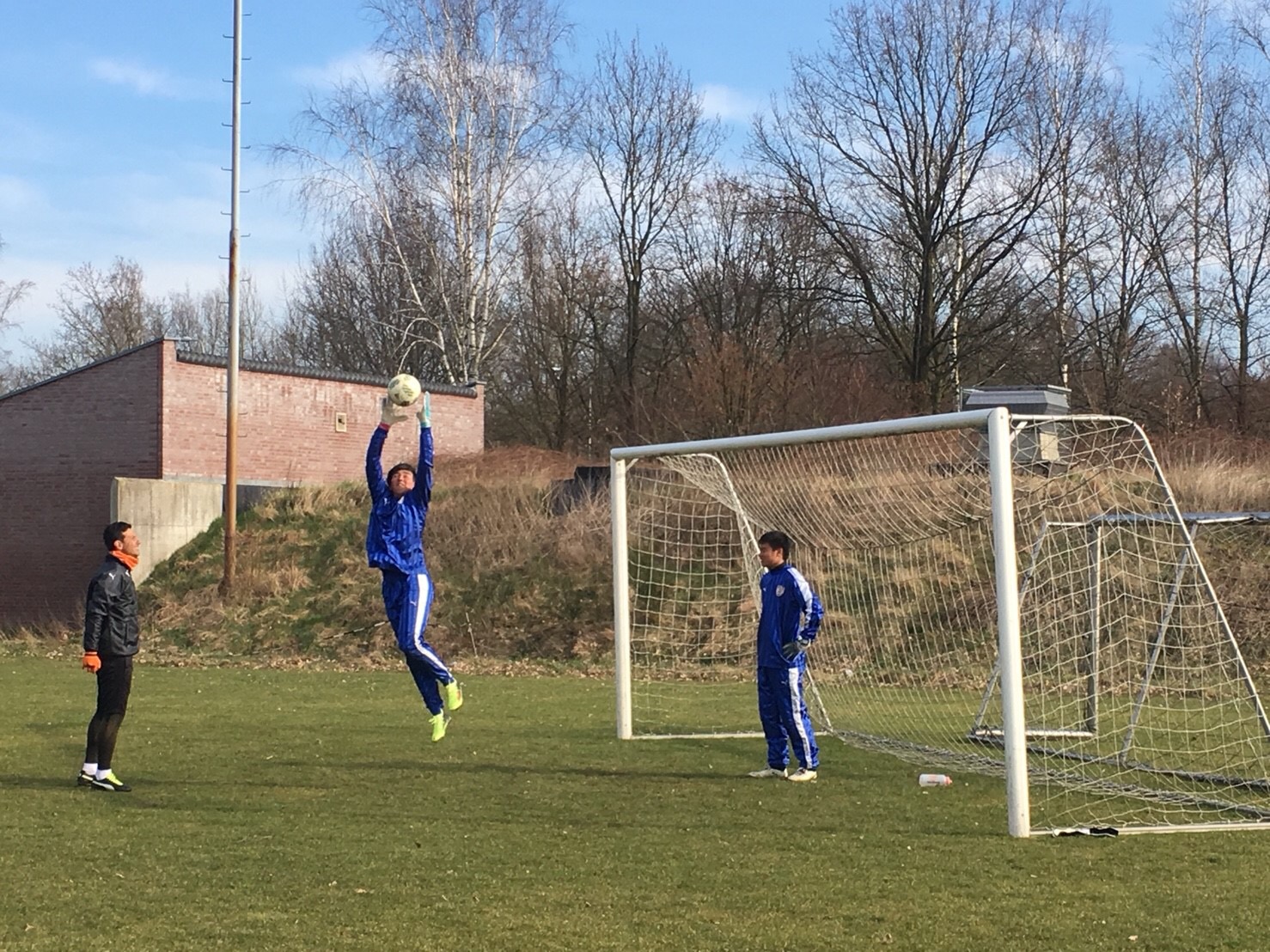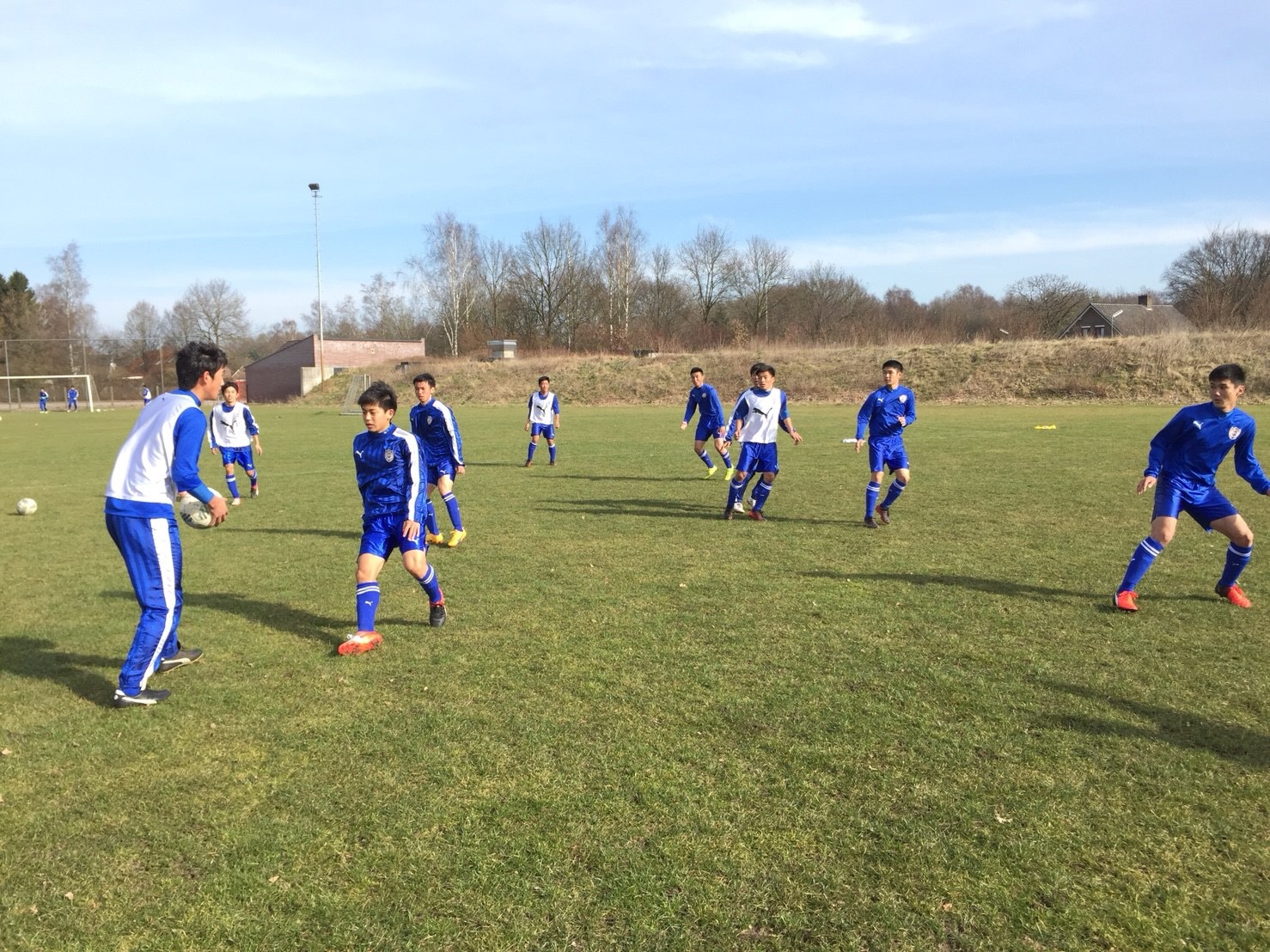 午前中は、De Poort Hotelが提携しているクラブチームのグラウンドをお借りして、今遠征で初のトレーニングを行いました。宿泊しているゴッホは、ドイツとオランダの国境に位置しているため、バスでグラウンドに移動する途中に国境を越え、オランダ国内にあるグラウンド、スポーツパークde Heijkuulにて練習を行いました。町クラブでありながら、天然芝のグラウンドやスタンド付きの人工芝グラウンド、クラブハウスも有しており、サッカー環境の整備において日本はもっと努力が必要であることを実感しました。トレーニングでは、選手たちは粘土質の土壌に生える天然芝のグラウンドに多少苦労しながらも、しっかりとボールを見て、止めて、蹴るという基本技術を高めるために、集中して取り組む一方、楽しい雰囲気の中でトレーニングを行いながら汗を流しました。