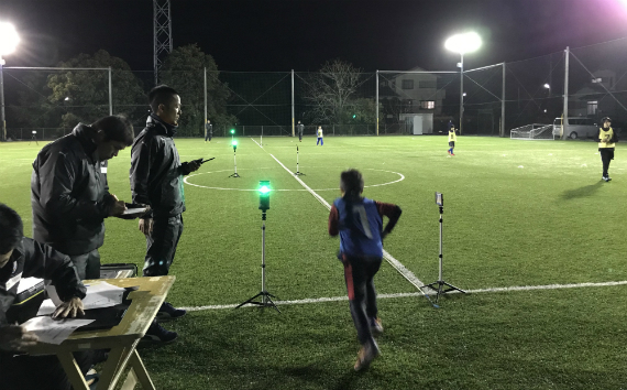 体験会ではまず、エスパルスのフィジカルテストでも実際に用いている光電管を使用して、30m走をより正確なタイムで計測し、その後に速く走るためのメカニズムを説明しました。