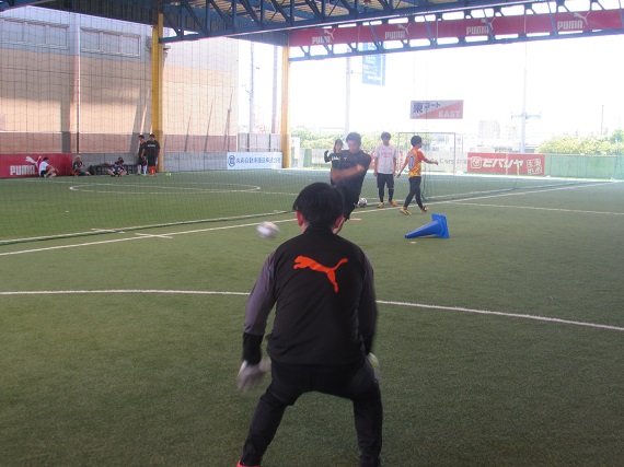 シュート練習ではボールを受ける前に予備動作を入れ、縦に突破するのか中に切れ込むのか、ゴールを決めるために考えながら練習を行ないました。参加者の方は少し難しい練習にも積極的にチャレンジをしてくれ素晴らしいシュートを見せてくれました。