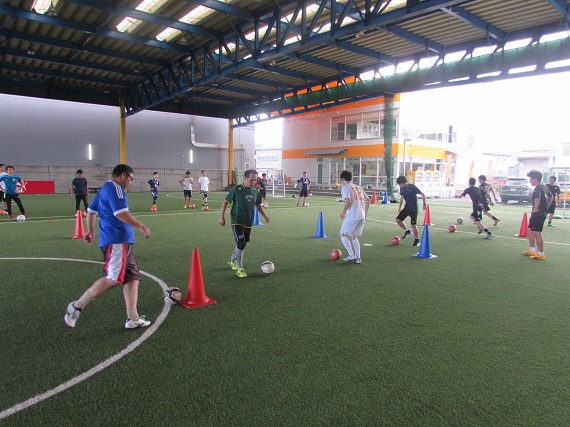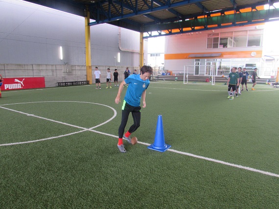 その後にドリブルドリルを行い、インサイド、アウトサイド、足裏などでボールを触りボール感覚を養っていき、ボール扱いに慣れていきました。