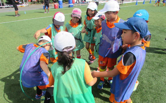 スタンプラリーでは12エリアのアトラクションをチームで協力し、攻略を目指しました。今回全攻略できたのは河井&長谷川選手チームの1チームのみ。中でも苦戦していた競技は「ラグビーボールドリブル」と「くっついて立ち上がろう」です。「くっついて立ち上がろう」とは、全員が手を繋ぎ、前向き・後向きで一緒に立てればクリアといった種目です。審査員コーチのジャッジが厳しく、なかなかクリアするのが大変そうでしたが、難しかった分、クリアできたときの達成感、充実感があり、子どもたちの嬉しそうな表情や喜ぶ声を見聞きすることができました。その他にも、「フープリレー」や「サッカーゴルフ」など楽しいアトラクションばかりで、暑い中みんなで協力しながら楽しく頑張ってゴールを目指してくれました。