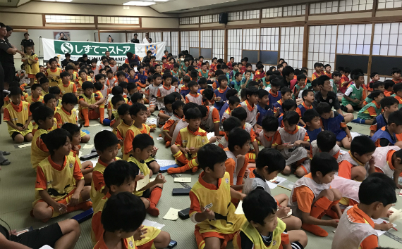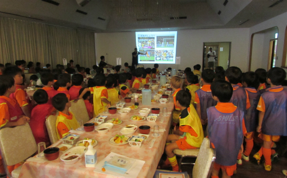 その後、宿泊でお世話になる三保園ホテルへ移動し、夕食の前には萩原(とよ)コーチが食育講座を行いました。エスパルスのトップ選手の身長・体重、激しく相手選手と競り合うクリスラン選手、六反選手がゴール前でボールをキャッチする写真を見て、プロになるためにはたくさんバランス良く食べて、強い体を作らなければならないと学びました。
