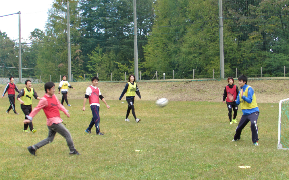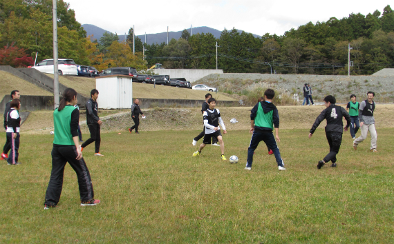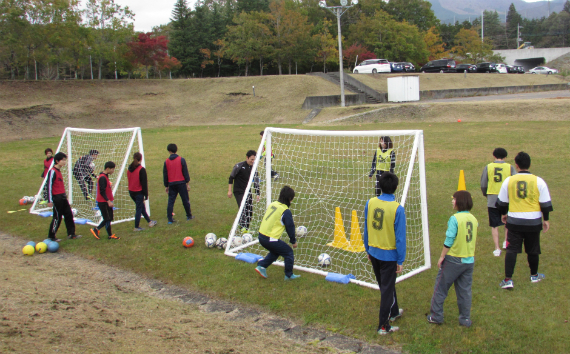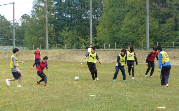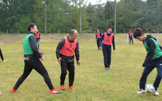 試合前には、ドリブルの仕方(通称:ペンギン歩き)、キックの種類、ボールの止め方、シュートを各チームで競争しながら、参加者同士で笑いながら楽しく体験していただきました。