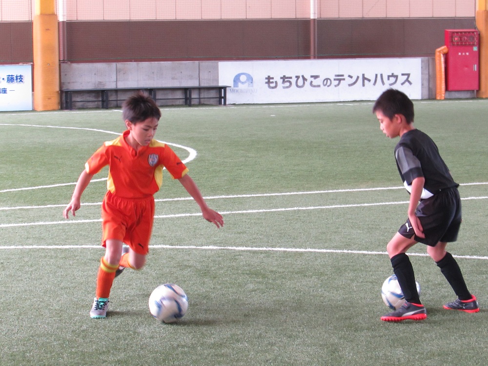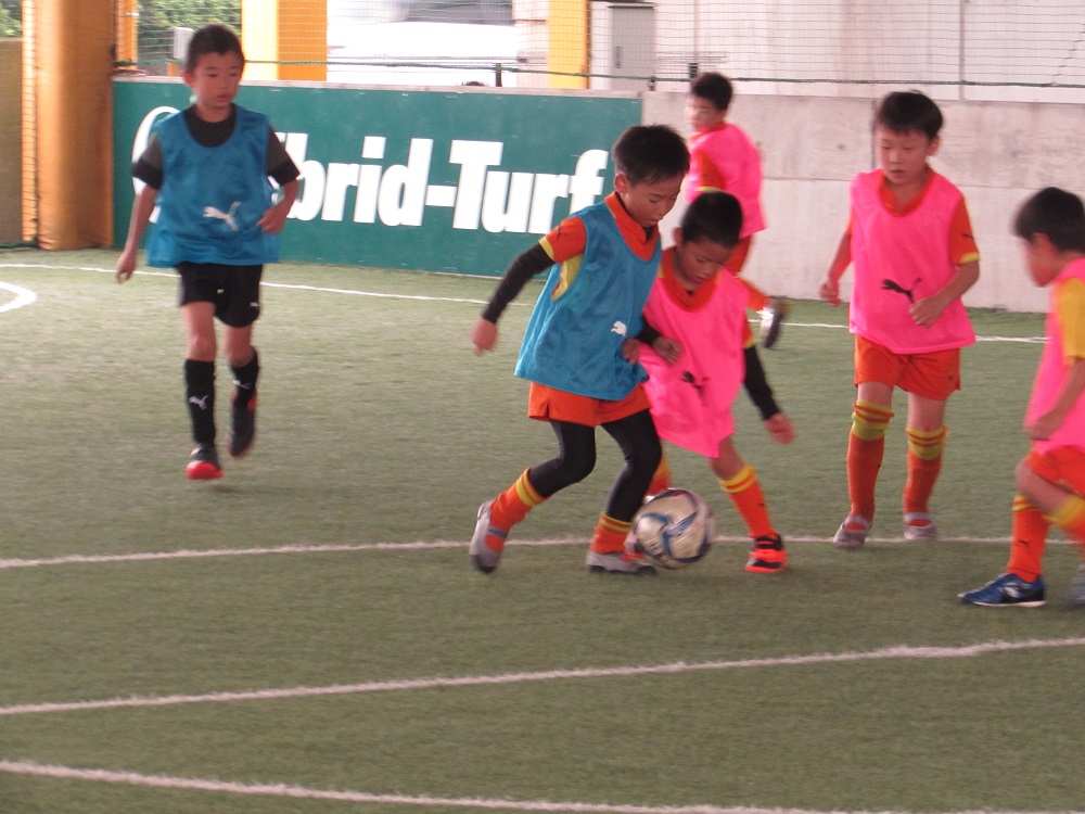 ステップワークのトレーニングでは、姿勢や目線、リズムを意識して行いました。その後のボールフィーリングではこのトレーニングを活かし、ボールから足を離さず後ろに引く練習や、足の裏で転がして相手をかわすボールタッチなどの練習をしました。ボールを蹴る強さや、足の裏のボール扱いに苦戦しながらも、一生懸命取り組んでいました。