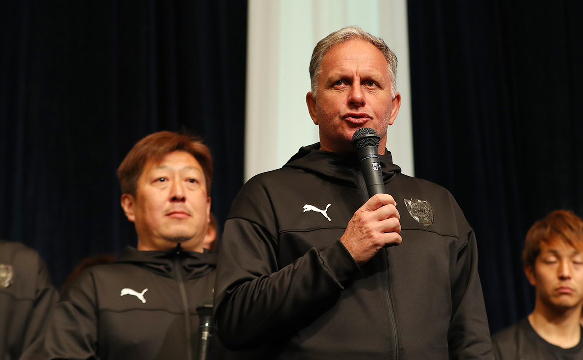 今ちょうど、ここで鹿児島牛を食べさせていただきました。本当に美味しかったです。昨年の皆さまのご声援、サポートありがとうございました。キャンプでのご声援、サポート、また鹿児島デーもありましたが、お礼を申し上げたいと思います。去年のキャンプでの出来は、本当はあまり良くなかったのです。しかし、シーズンが始まっていく中で、だんだんチームとしては良くなりました。今年もそういった形で、だんだん良くなっていく、良いシーズンになっていくことを望んでいます。皆さまとのお付き合いは伝統となっています。鹿児島県に来させていただいて16年、鹿児島市で14年経ちます。今後とも、皆さまの厚いご支援をいただきながら戦って行きたいと感じております。今後しっかりと練習して皆さまのご声援とともに、一緒に今シーズンを戦っていきたいと思います。よろしくお願いします」