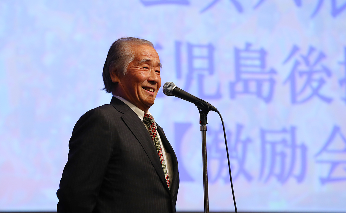 「いつもいつも来るたびに思いますが、1,000kmという距離を全く感じさせない、皆さま方の温かいおもてなし、心強いサポートを深く感謝しております。先ほどお話がありました、鹿児島での後援会が68社になったという話をうかがいました。今日ここに75名の方々が来ていらっしゃるとうかがいしました。熱い気持ちで、心温まるご支援、応援を物心両面で頂いているという、あたかもここが静岡の隣県であるがごとく、距離を全く感じさせない皆さまのお心を、いつも激励会を開いていただくときに感じる次第であります。会社としては一桁順位を勝ち取ろうということで、昨年8位になりました。全ては鹿児島から始まりました。今年も、鹿児島から始まって、トップ5を狙わないといけないという手応えを感じながらシーズンを迎えたと思っております。いずれにしても、皆さま方の温かい、心温まるご支援に報いるのは、この鹿児島でスタートした今シーズンの最後に、今申し上げたお約束を果たして、なおかつ見ていてとてもエキサイティングで、とてもインテリジェンスがあって、タフな、面白いサッカーをお見せできることだけが皆さまへの恩返しだと思っております。そのスタートとして、今日のこの壇上に立って皆さま方にそういったお約束をさせていただきます。最後に鹿児島デーは現在のところ無敗であります。きっと皆さま方の熱い想いがチームを後押ししてくれているんだと思います。簡単ではありますが、御礼のご挨拶とさせていただきます。ありがとうございます」