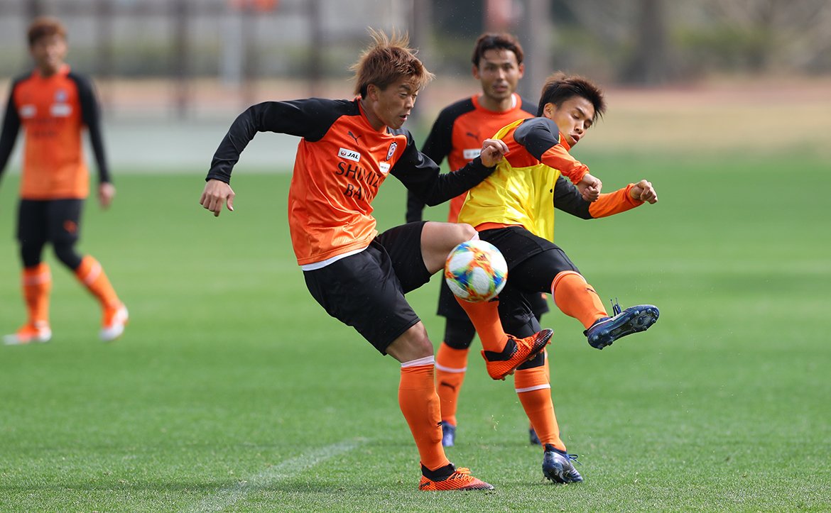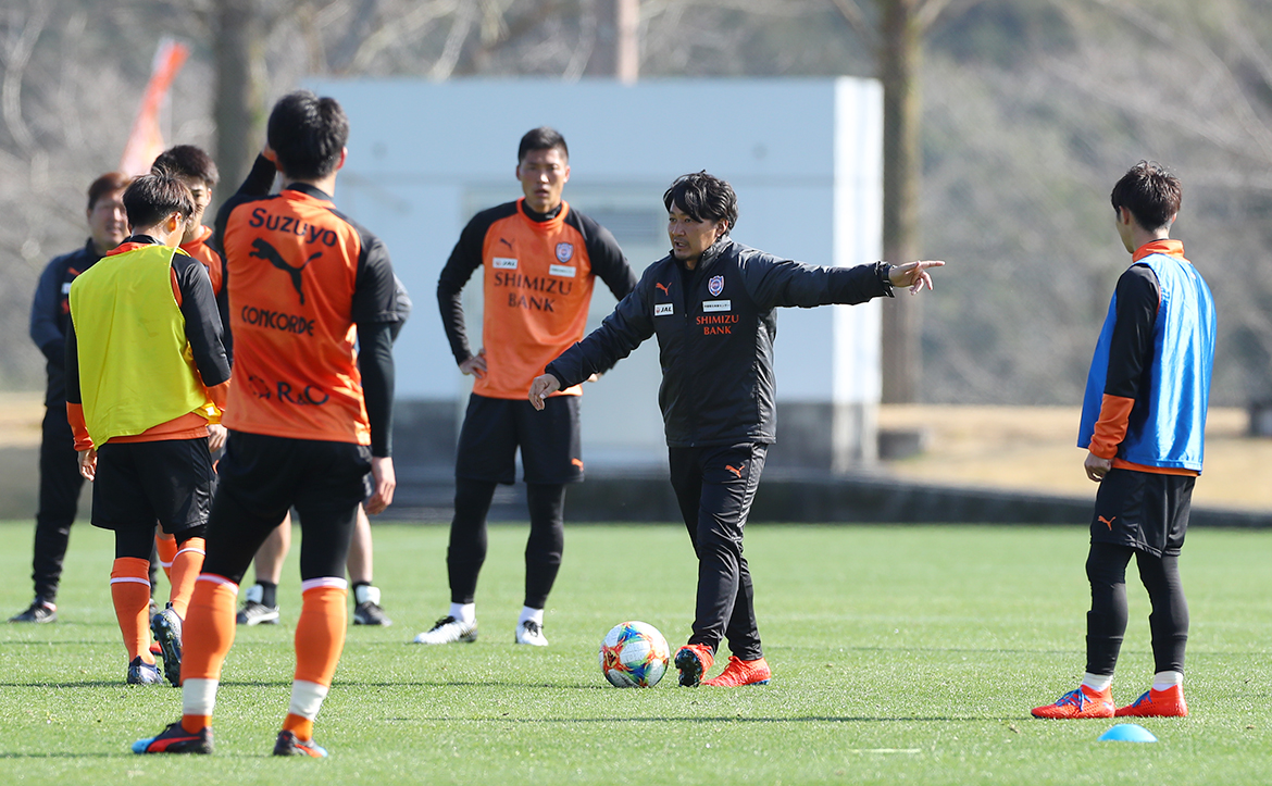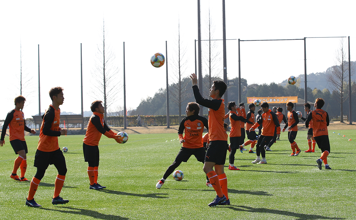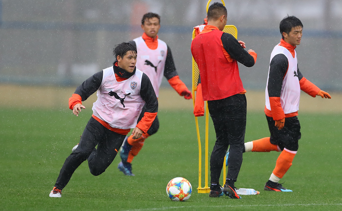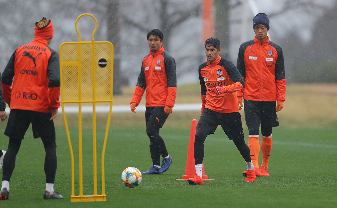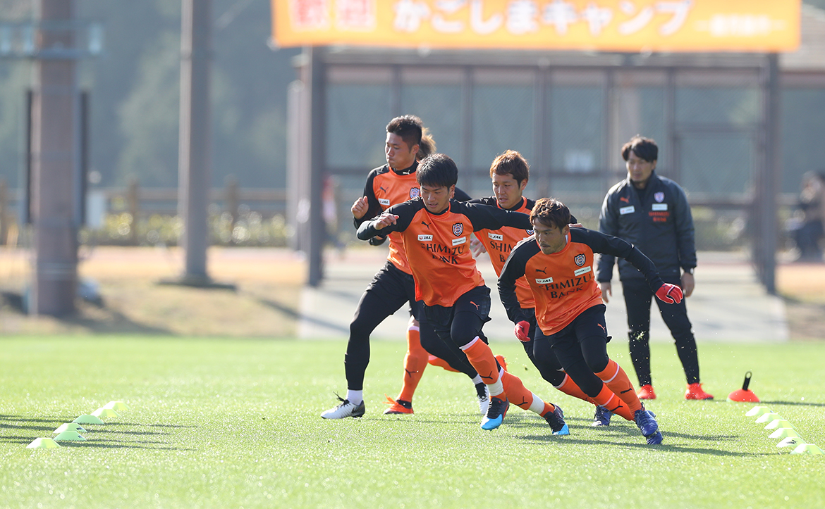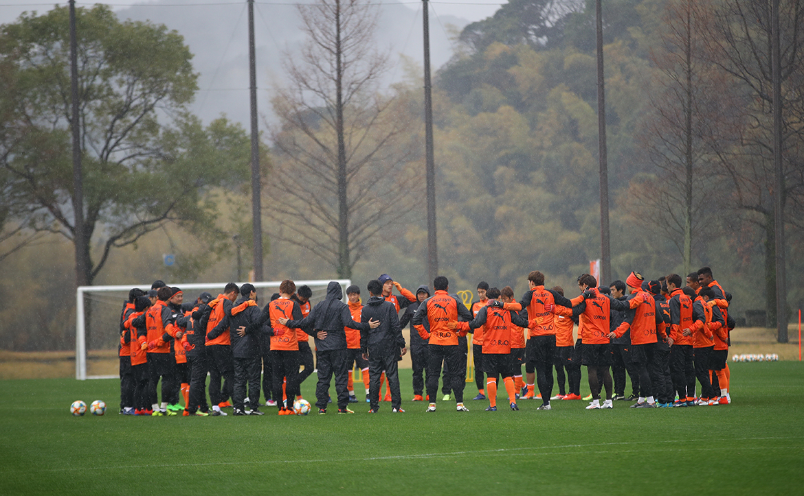 この頃には薄暗くなり、キャンプ初日以来となる照明灯が付けられた。しかも、相当な雨量でも水が浮かないというグラウンドコンディションのため、ボールが走ってプレースピードも速くなった。そうした環境で選手たちの気持ちも高揚しているようで、フォーメーションを組んでのシュート練習では、鄭大世が「決める!」と叫びながらシュートを打つなど気合が入っていた。かと思えば、滝裕太はクロスからヒールでシュートを打つなどテクニックの高さを見せつけるなど、それぞれの個性が見られた練習になった。最終ラインからサイドチェンジでボールを運ぶパターンや、フォワードが落としてボランチからサイドに振ってクロスまで持ち込む形など、様々なバリエーションでシュートまでの道筋を確認した。