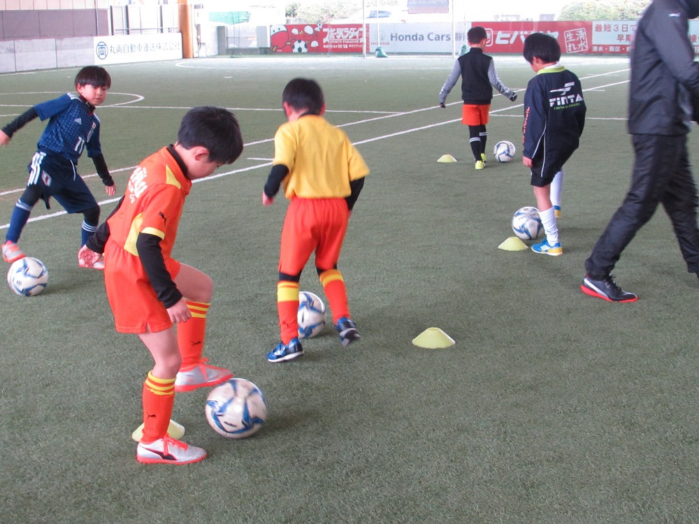 そのあとは、マーカーを使って足の裏のボールテクニックのトレーニングを行いました。自分の近くにボールを置くことを意識しながら取り組み、ボールの触り方が難しいところもありましたが、できるまであきらめずにチャレンジしていました。