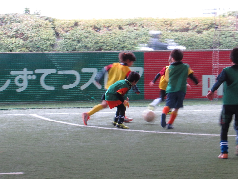 最後の試合はコーチチームを入れて、5チームで対戦し、1点入ったら交代というルールで行いました。コーチからボールを奪おうと何回も取りに行く姿や、積極的にゴールを目指す姿がみられました。ボールを取られたら最後まで追いかけ、体を張ってゴールを守る選手もいて、とても白熱した試合となりました。