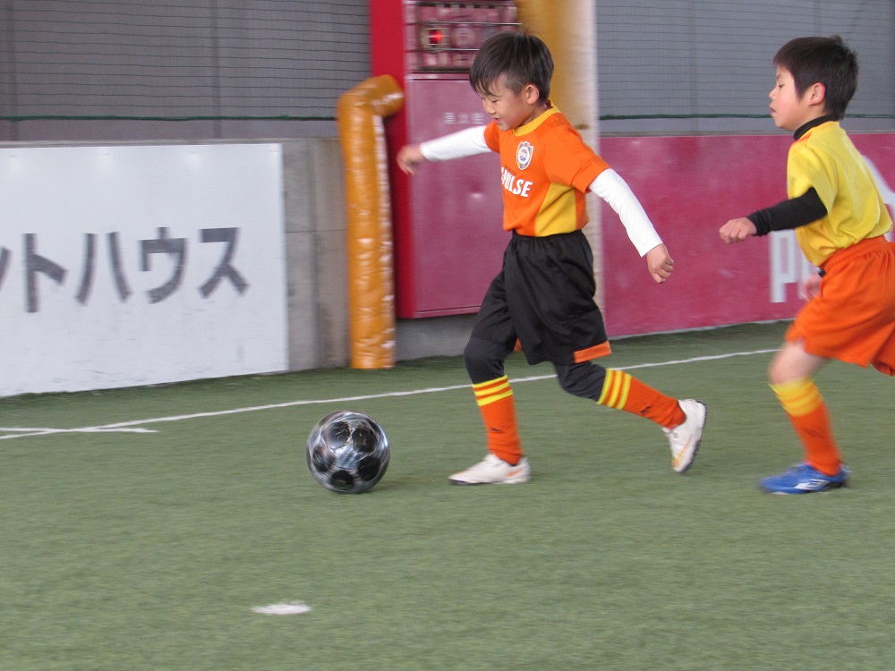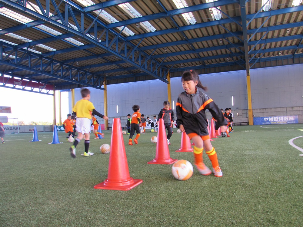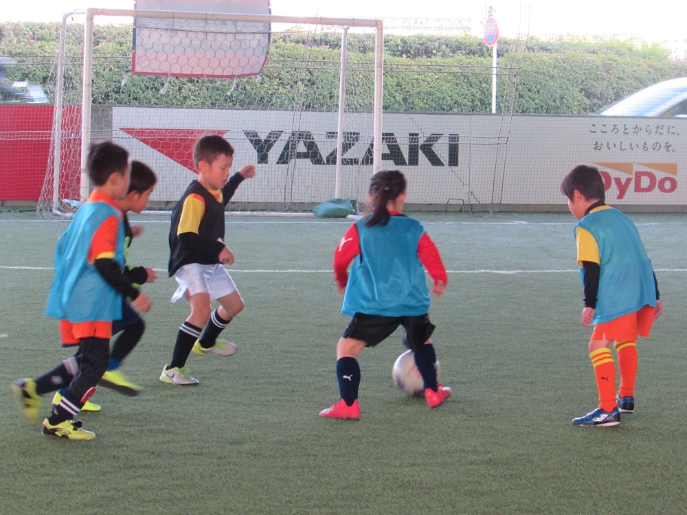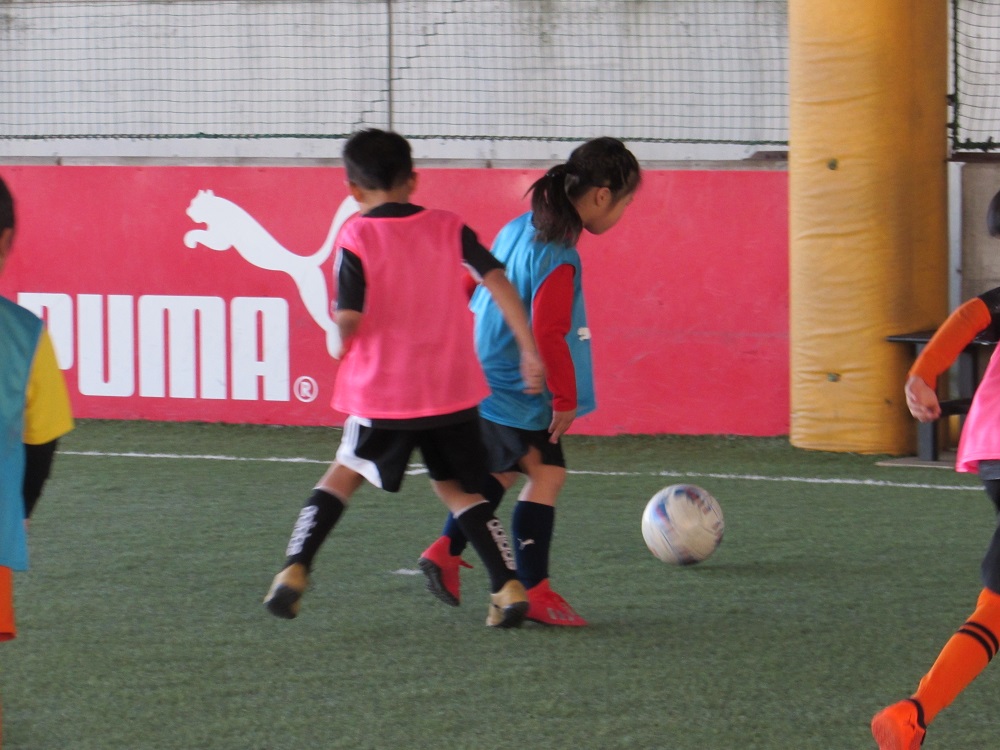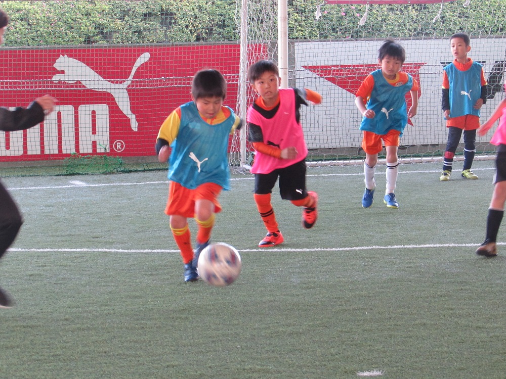 また今回からは対人プレーに取り組みました。1対1の4ゴール(ドリブル突破でゴール)を行い、先ほど練習したフェイントをしてみたり、相手のいない方へターンし他のゴールを目指してみたりといったプレーもみられました。途中ゆうたコーチが全員を集め、スピードを上げて突破する時と状況を観てかわす時の2種類の場面について話をしました。その後はゆうたコーチに言われたことを意識しながら取り組み、とても集中したトレーニングができました。