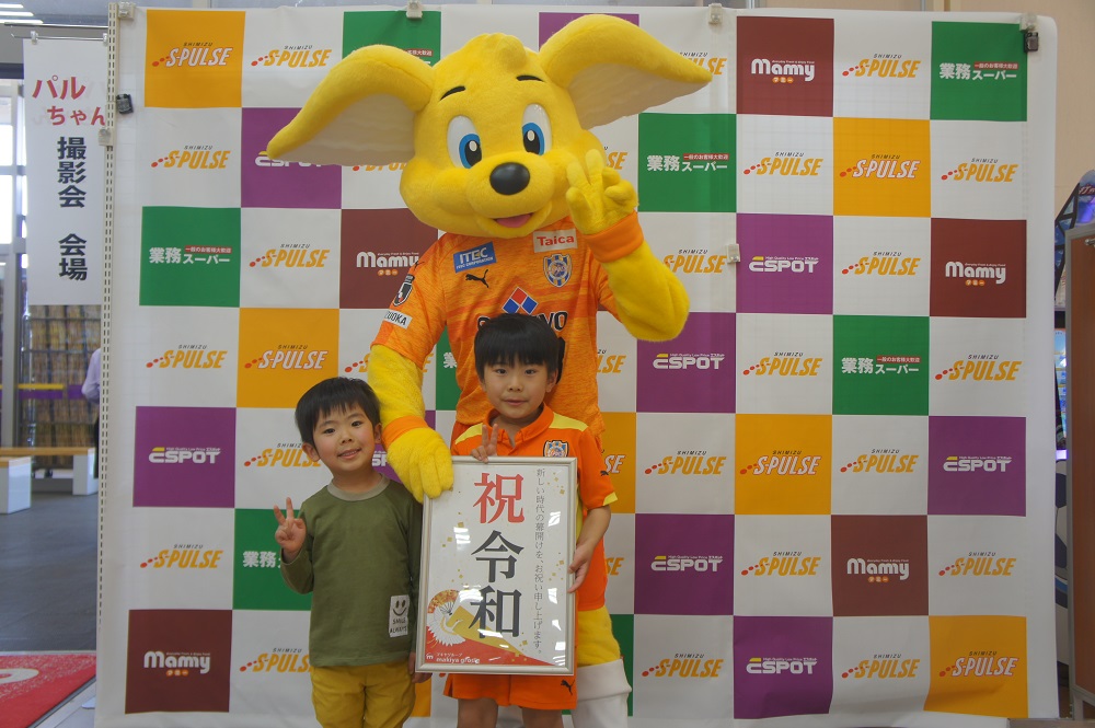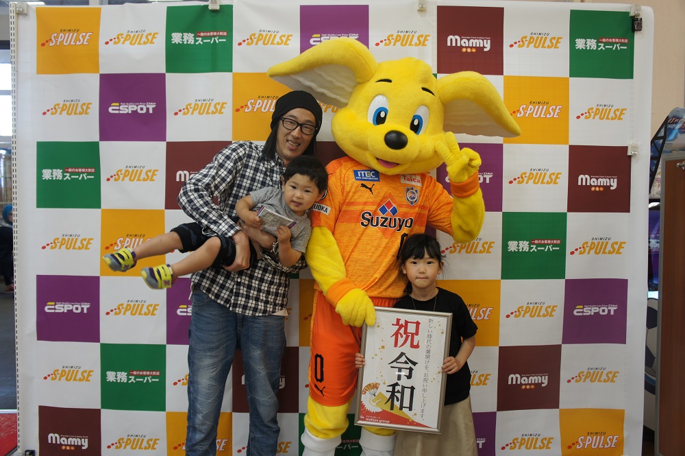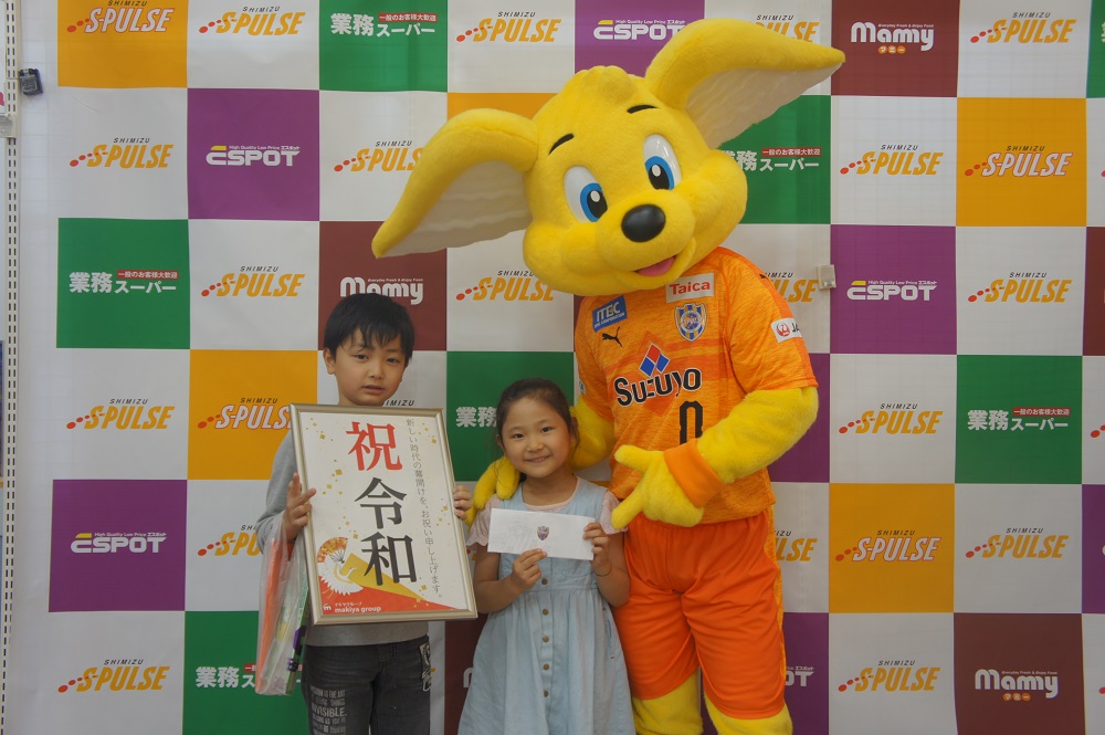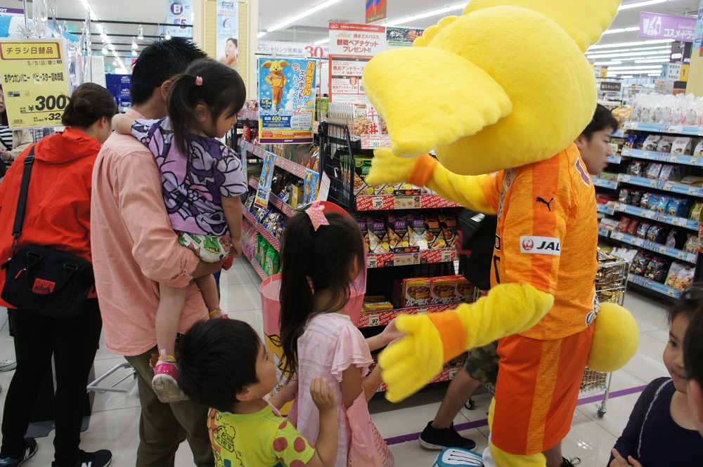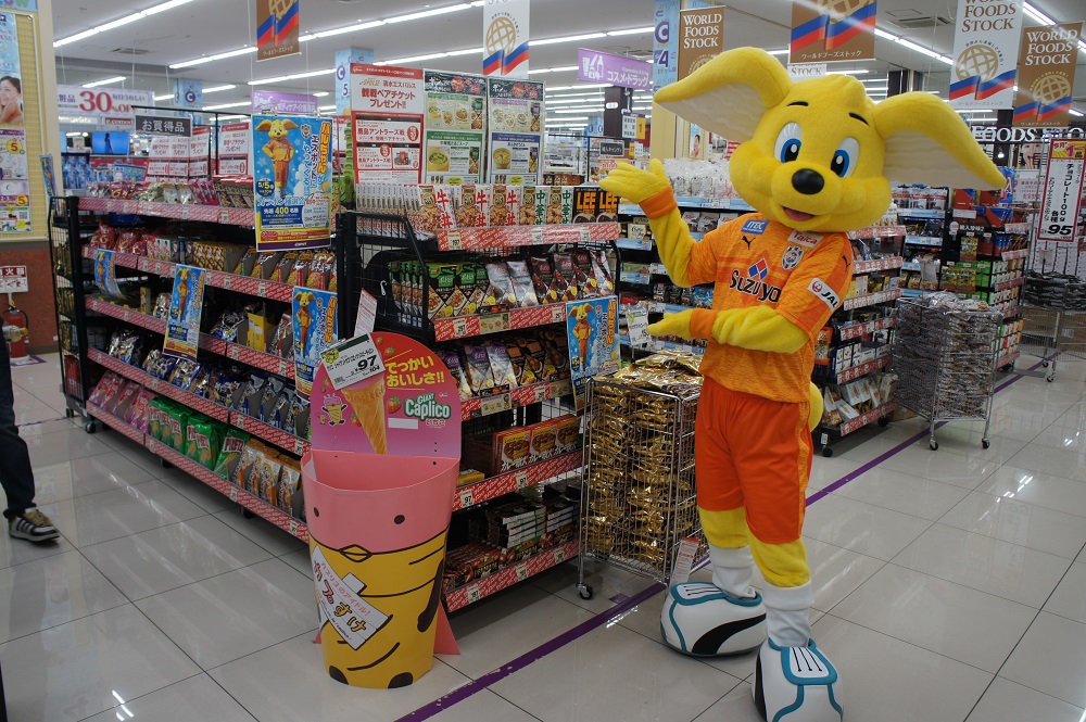 パルちゃんはエスパルスのチケットやグッズが当たるガラポン抽選会のお手伝いなどで店内を盛り上げるなど大活躍。特に、抽選会参加に必要となる江崎グリコ商品の購入を勧めるため、該当商品が陳列された棚で呼び込みを頑張る姿が印象的でした。さらに、記念撮影では多くのご家族連れやお子様と触れ合いながら丁寧にファンサービスを行い、約1時間のイベントを終えました。