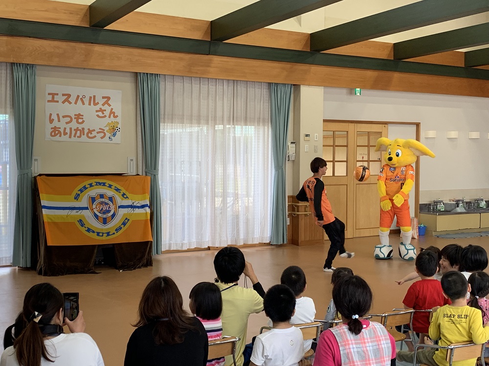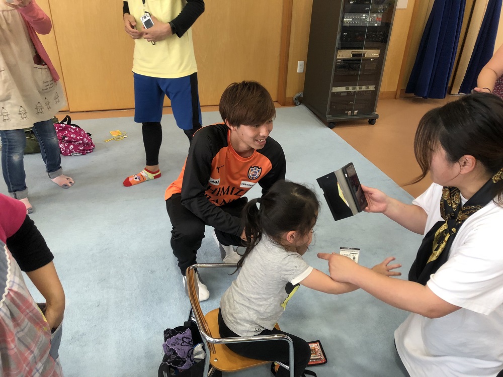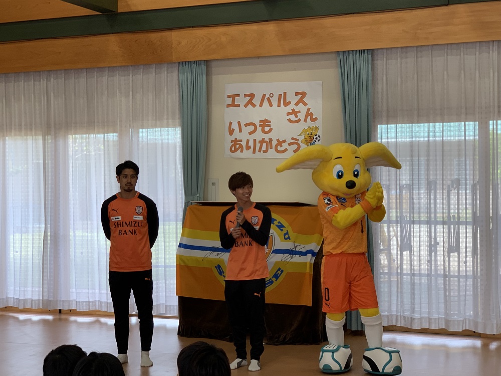 児童たちとのふれあいの時間では、高橋選手がリフティングの技術を見せ盛り上げました。記念撮影でも大人気のパルちゃんと両選手。両選手からは選手カード(エスパルス後援会提供)がプレゼントされました。両選手とも、短い時間でしたが子供達との交流を楽しみ、元気をいただいたようです。