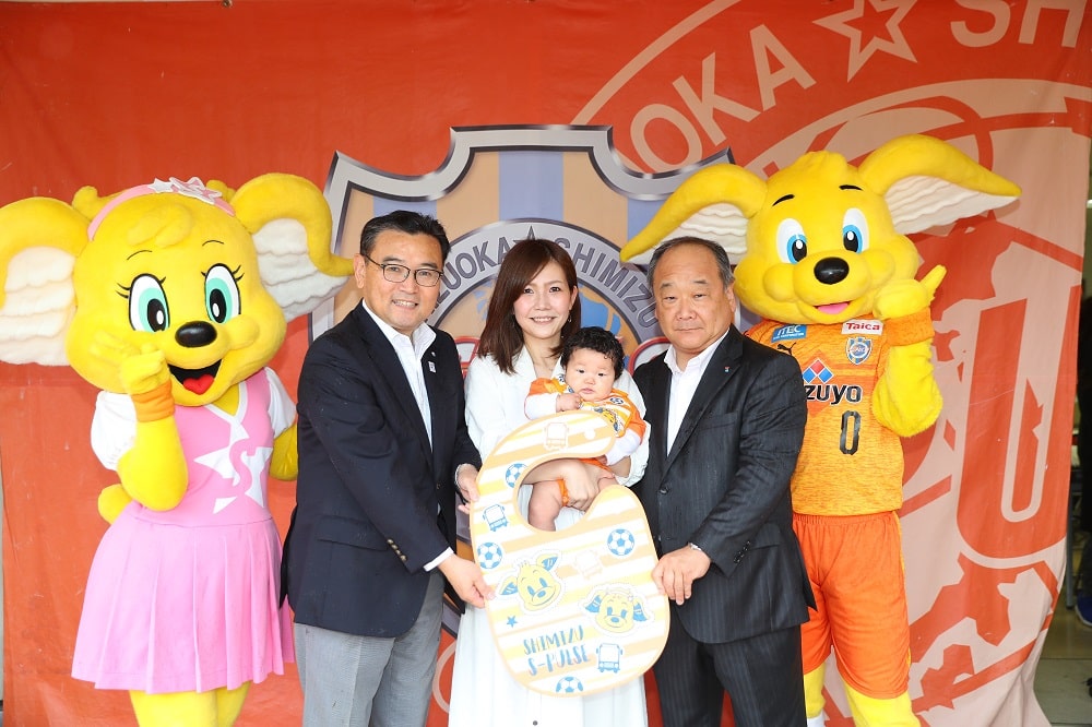 エスパルスは静岡市と共同し、2012年から子育て応援事業『エスパルスハロープロジェクト』を実施しております。当事業の一環としてホームタウン静岡市に誕生した乳児の皆さまに、夢を持って元気よく育ってほしいという願いを込めて『エスパルスオリジナルベビースタイ』をプレゼントするもので、贈呈式には乳児親子代表の鎌田様、小長谷重之静岡副市長、また当事業にご賛同いただきましたしずてつジャストライン株式会社 代表取締役 三浦孝文様にご出席いただきました。この『エスパルスオリジナルベビースタイ』は市内在住の乳児家庭を訪問する『こんにちは赤ちゃん訪問』にて配布されます。