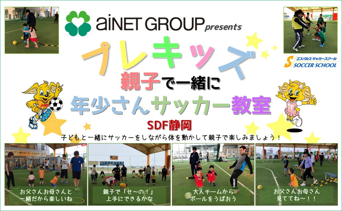 清水エスパルスは、地域事業応援パートナー あいネットグループ様ご協力のもと、9月1日(日)にエスパルスドリームフィールド静岡にて、年少児の子ども1名と保護者1名の親子を対象とした『あいネットグループpresents プレキッズ 親子で一緒に年少さんサッカー教室』を開催いたします。