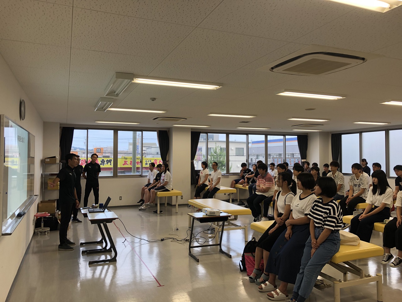 清水エスパルスのメディカルスタッフ宮間 幸久トレーナー・前澤 龍一郎トレーナー・志村 凌平トレーナーが8月21日(火)、学校法人鈴木学園専門学校中央医療健康大学校にて生徒と交流を行いました。