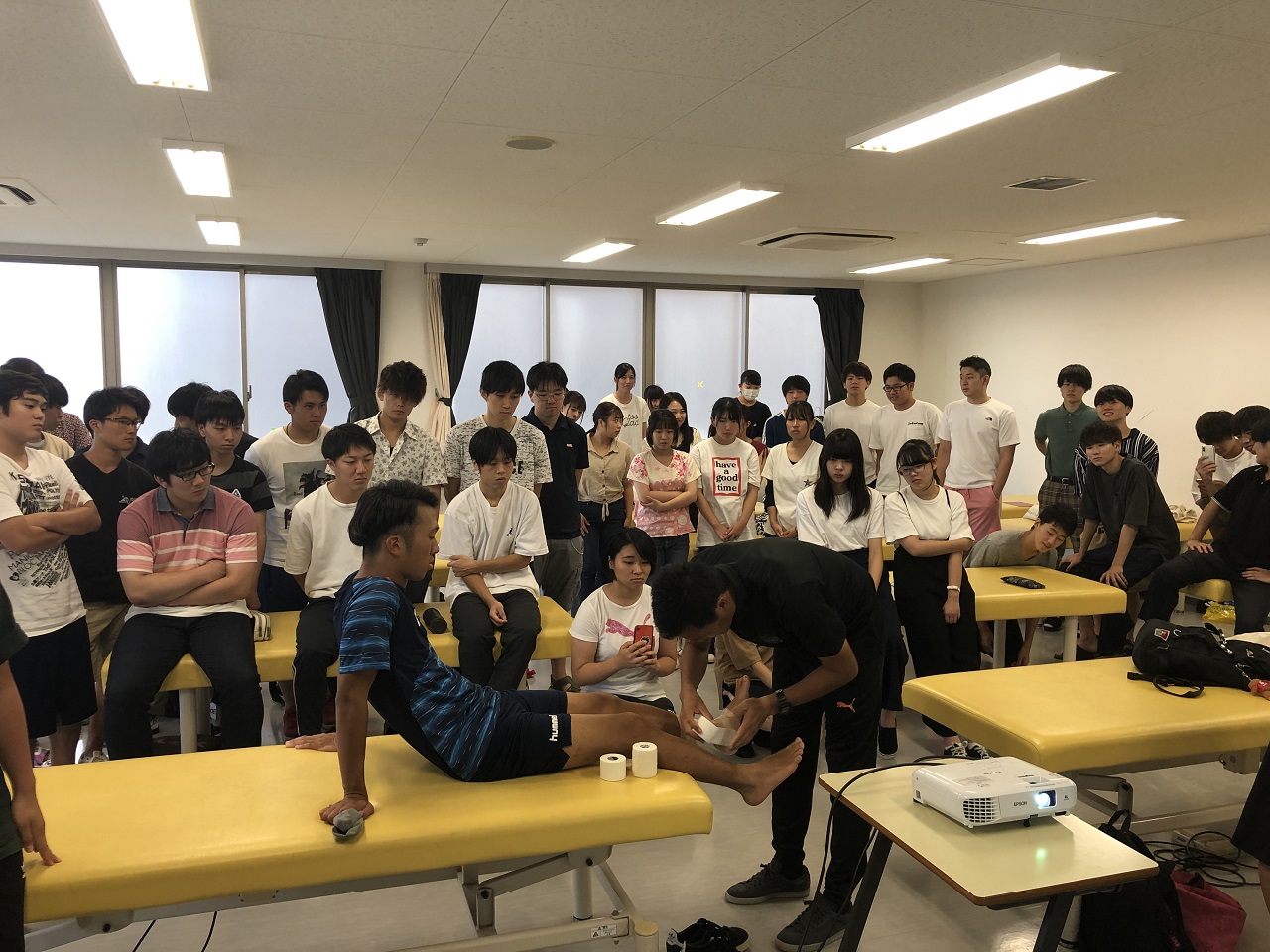 その後、テーピングの実演・講習を行い、生徒たちにも実際にテーピングを巻いてもらうと、いつでも早さや正確性が問われる現場で働いているトレーナー達の実技に驚きながら生徒たちも慣れない手つきでしたが、その技を盗もうと一生懸命取り組んでいました。