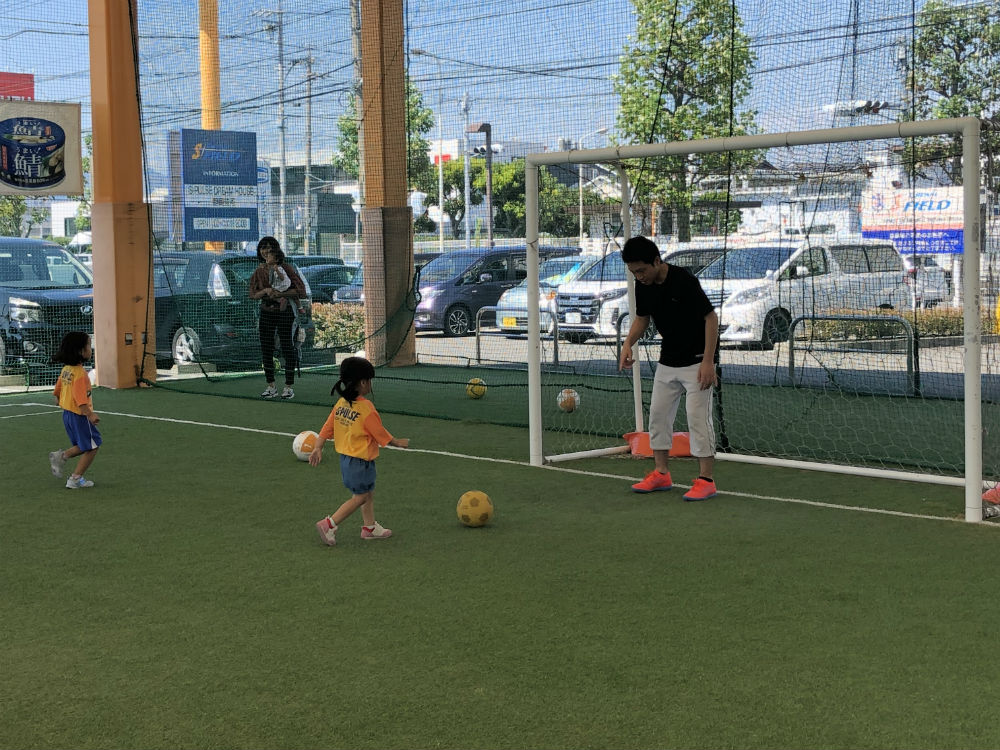 最後は3種類のセッションを自由にまわり、親子対決やシュート、サーキットを楽しみました。「ロケット発射」ではボールをセットして、転がるボールを追いかけシュートしました。中には「おとうさんが奪いに来るから急がないと!」と走ってシュートをする子や、「ゴールしたよ!」と喜ぶ子など、何度もボールをセットしてやっている子が多く、楽しくシュートをしていました。「サーキット」では、ジャンプ中心のもので、色々な動きづくりがあり、何周も走り続けている子もいました。グーパージャンプやケンケン、高いジャンプなど、中にはかっこいい姿をおとうさんやおかあさんにみせようと一生懸命親子で一緒にやり、様々な形で楽しんでくれていたと思います。「親子でシュート対決」では、おとうさんやおかあさんに取られないようにシュートを打ちました。シュートが決まり、コーチとハイタッチをして喜ぶ姿が多く見られて良かったです。