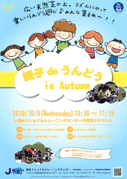 株式会社エスパルスが指定管理者として管理運営しています『清水ナショナルト レーニングセンター(J-STEP) 』にて、<親子deうんどうin Autumn>イベントを開催いたしますので、お知らせいたします。お子様とパパ・ママが芝生の上で心と体のコミュニケーションを大切に気持ちよく身体を動かしてみませんか。みなさまのご参加お待ちしております。