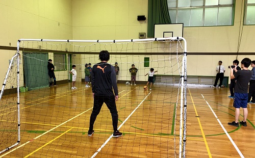 その後、現役時代はGKとして活躍した植草に対して、児童がシュートし決めることができるかを挑戦し、児童たちは元プロ選手から決めることがなかなか出来ずにいましたが、最後は至近距離からシュートしてもらい、決めた児童からは渾身のガッツポーズが見られました。また、実際にエスパルスの選手が行っている体幹トレーニングにもチャレンジしてもらい、プロ選手が行うトレーニングの厳しさを体験しました。
