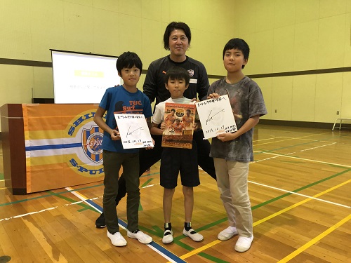 全ての授業を終えた後、代表の児童にサイン色紙をプレゼントし『エスパルスドリーム教室』は終了。植草は児童たちに対し「これから挫折したり、苦しい時期が訪れたとしても、ほんの少しずつでも階段を一歩一歩上がって行けば、必ず道は開けます。少しずつでも上がっていく行動をしてください!」とメッセージを送りました。