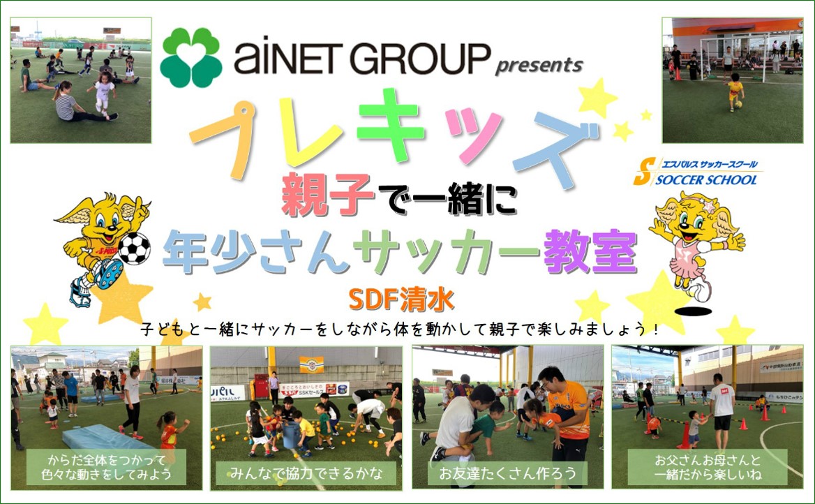 清水エスパルスは、地域事業応援パートナー あいネットグループ様ご協力のもと、11月24日(日)と12月8日(日)にエスパルスドリームフィールド清水にて、年少児の子ども1名と保護者1名の親子を対象とした『あいネットグループpresents プレキッズ 親子で一緒に年少さんサッカー教室』を開催いたします。
