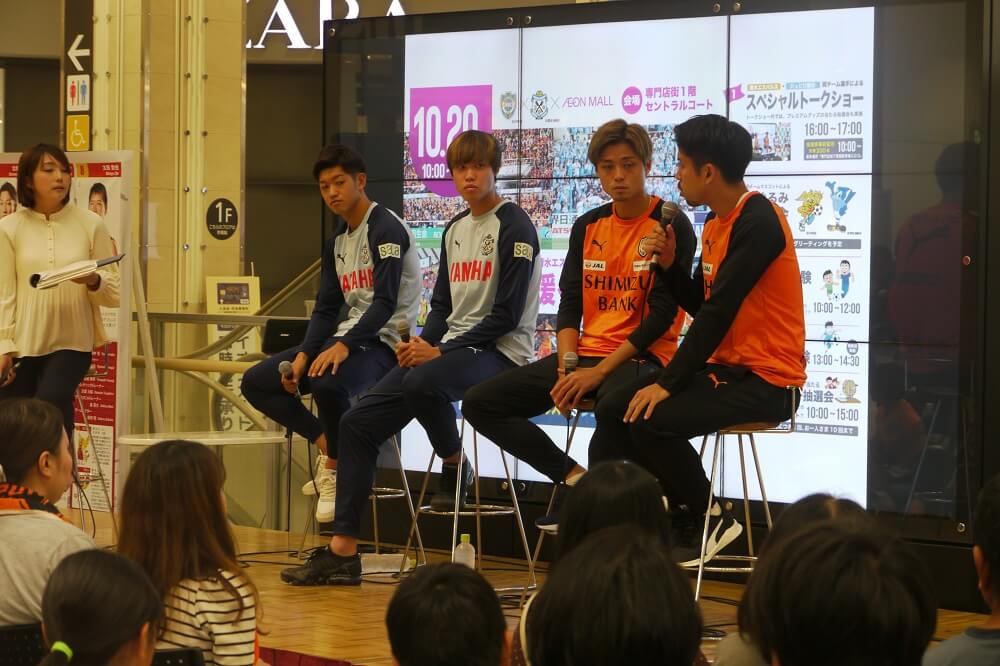 16時から始まった両チームの選手によるトークショーは約40分。今季について、これまでの振り返りやお互いのチームの印象、静岡ダービーへの意気込みなど、内容盛りだくさんでした。竹内選手、松原選手は浜松出身とあり、約300人の地元サポーターや仲間から応援の言葉を数多くいただきました。トークショー後には抽選会を行い、当日参加した4選手のサインが書かれた色紙やボールのほか、その場で選手がサインを書いたゲームシャツなどが当たりました。