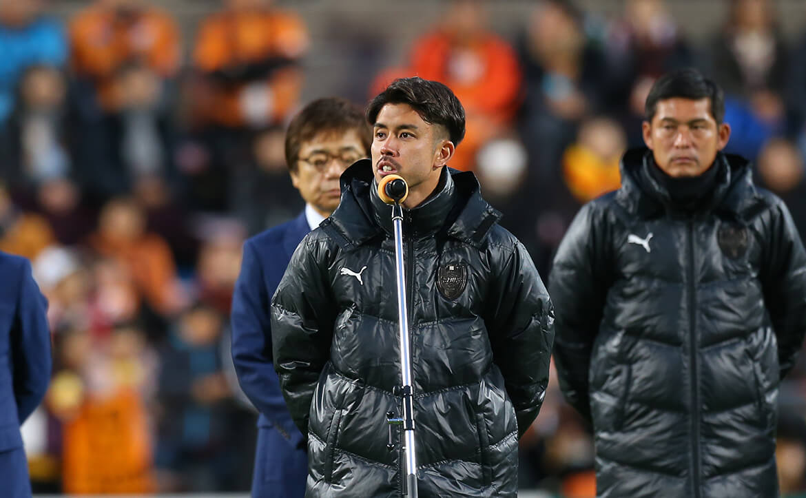 今日、このスタジアムをこのような雰囲気にしてくださり、本当にありがとうございます。本当に感謝しています。この応援があって負ける訳はないと思っていました。ただ、このような雰囲気を今日だけでなく、毎試合感じたいですし、毎試合今日のような試合をしたいです。そのためには、僕たち選手が強くなって「応援宜しくお願いします。背中を押してください」ではなく「僕たちについて来い」と言えるようなチームにならなければなりません。そしてそのチャンスが次の試合、神戸にあります。この雰囲気にしてください。僕たちは皆さんの為に闘います。次もみんなで勝ちましょう。1年間、ありがとうございました。