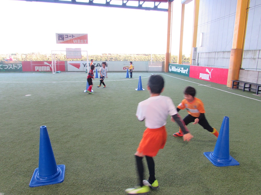 ウォーミングアップでは、2人1組でコーンの周りをまわる鬼ごっこをしました。走る、後ろ向きで走る、ケンケンをしながらの動きづくりの部分も取り入れ、最後はドリブル鬼ごっこをしました。ボールを使って行った際には、「身体を相手に向け観ながらプレーをすると、どこに相手がいるかわかるよ」とコーチが伝えると、その後意識しながら取り組んでいたのがとても印象的でした。
