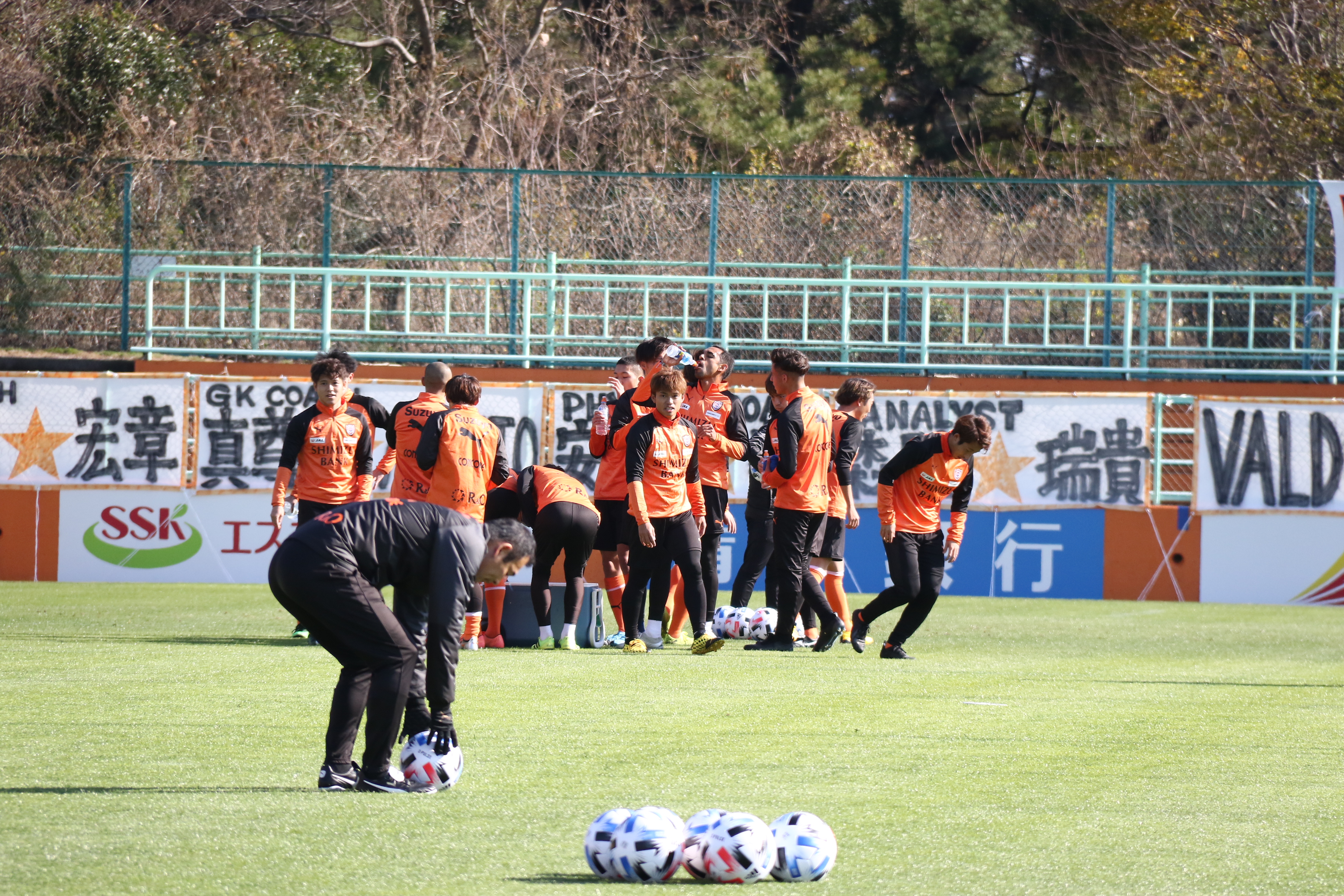 トレーニングに先立ち、選手・コーチングスタッフ・チームスタッフが一堂に会してミーティングが行われました。山室社長、大熊GMの挨拶から始まり、大榎強化部長より新加入スタッフ、選手、そして期限続き移籍から復帰した選手が紹介されました。