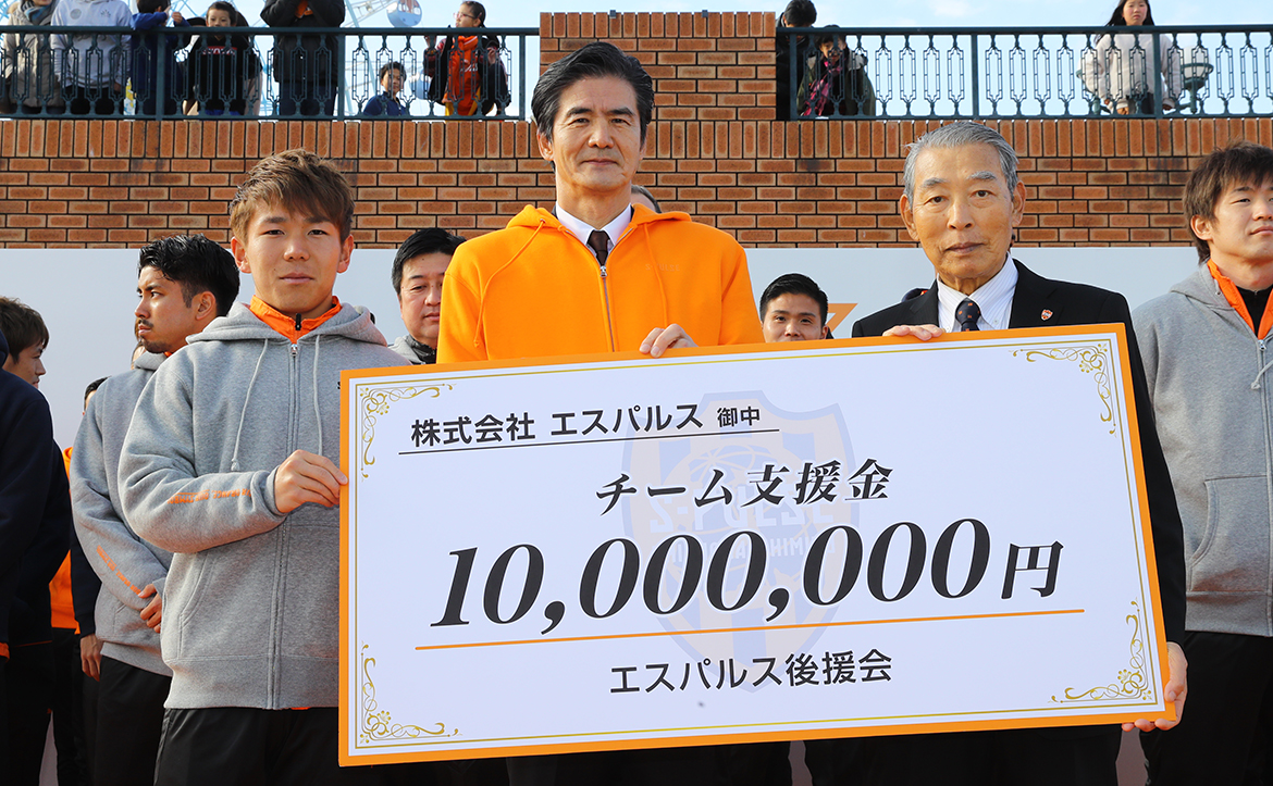 「チームは明日から鹿児島キャンプに入ります。私も何度かお供させていただいたこともありますが、選手一人ひとりは力を十分発揮できるような、自分に対して厳しい練習をしていただきたい。そして、たくましくなって日本平に帰ってきてもらいたい。それが私たち、静岡のファンの気持ちであります。今日お集まりの後援会の皆さん、そしてファン・サポーターの皆さん、新しいシーズンが始まります。勝った時には大きな声援で選手を迎え、ともに喜びを分かち合いましょう。そして、もし運なく敗れて帰ってきた時には、うつむいて下を向いている選手、監督を優しく支え、「私たちの応援が足りなかったのかもしれない」そういう言葉で、次の試合で頑張ってもらえるような活力を与えてあげてください。それが、富士山に守られ、地元の皆さんに守られているエスパルスの最高の立ち位置ではないでしょうか。最後に、今年一年色々なことがあるかもしれない。どんな時にも、決して諦めない強い精神は、ここ数年間で我々は鍛え上げられてしまっています。我々はエスパルスのファミリーです。一人ひとりが、エスパルスの家族なんです。その気持ちで一年間頑張りましょう。よろしくお願いします」エスパルス後援会からは1000万円のチーム支援金をいただきました。