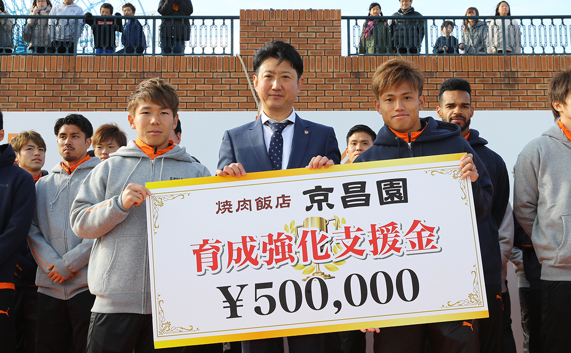 その後、クラブパートナーの有限会社京昌園より、育成強化支援金50万円、お食事商品券10万円分、株式会社シズオカミートより、チームの激励を目的とした「しずおか和牛サーロイン 10kg」の贈呈式が行われました。