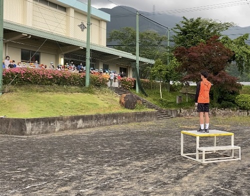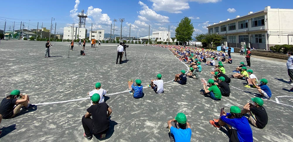 感染症対策のため、全学年380名を校舎側からの参加と校庭側からの参加に分け、ソーシャルディスタンスを保った状態で整列し、実施いたしました。