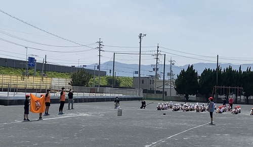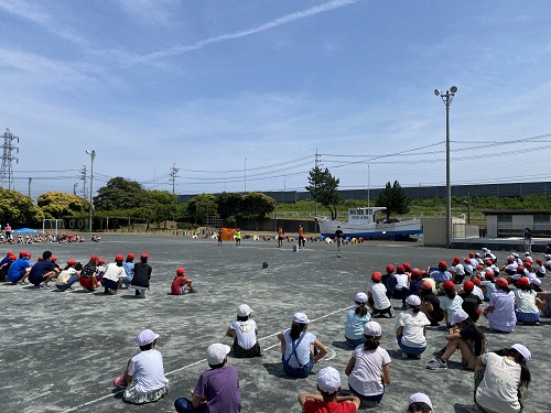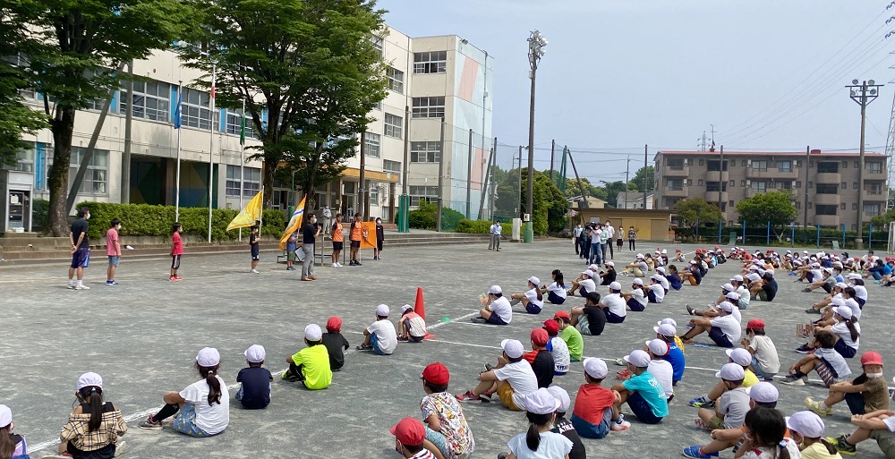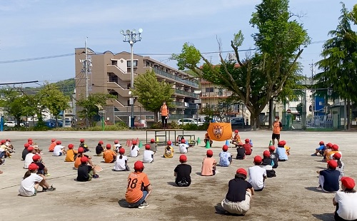 翌日の6月5日(金)は静岡市立蒲原東小学校に、滝裕太選手と梅田透吾選手が訪問しました。前述2校と同様に、感染症対策のため全学年231名が校庭に距離を保った状態で整列し実施いたしました。