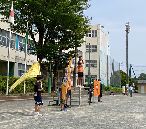 翌日の6月4日(木)は静岡市立横内小学校に、河井陽介選手と西澤健太選手が訪問しました。清水高部東小学校と同様に、感染症対策のため、6学年生93名が校庭に距離を保った状態で整列し実施いたしました。