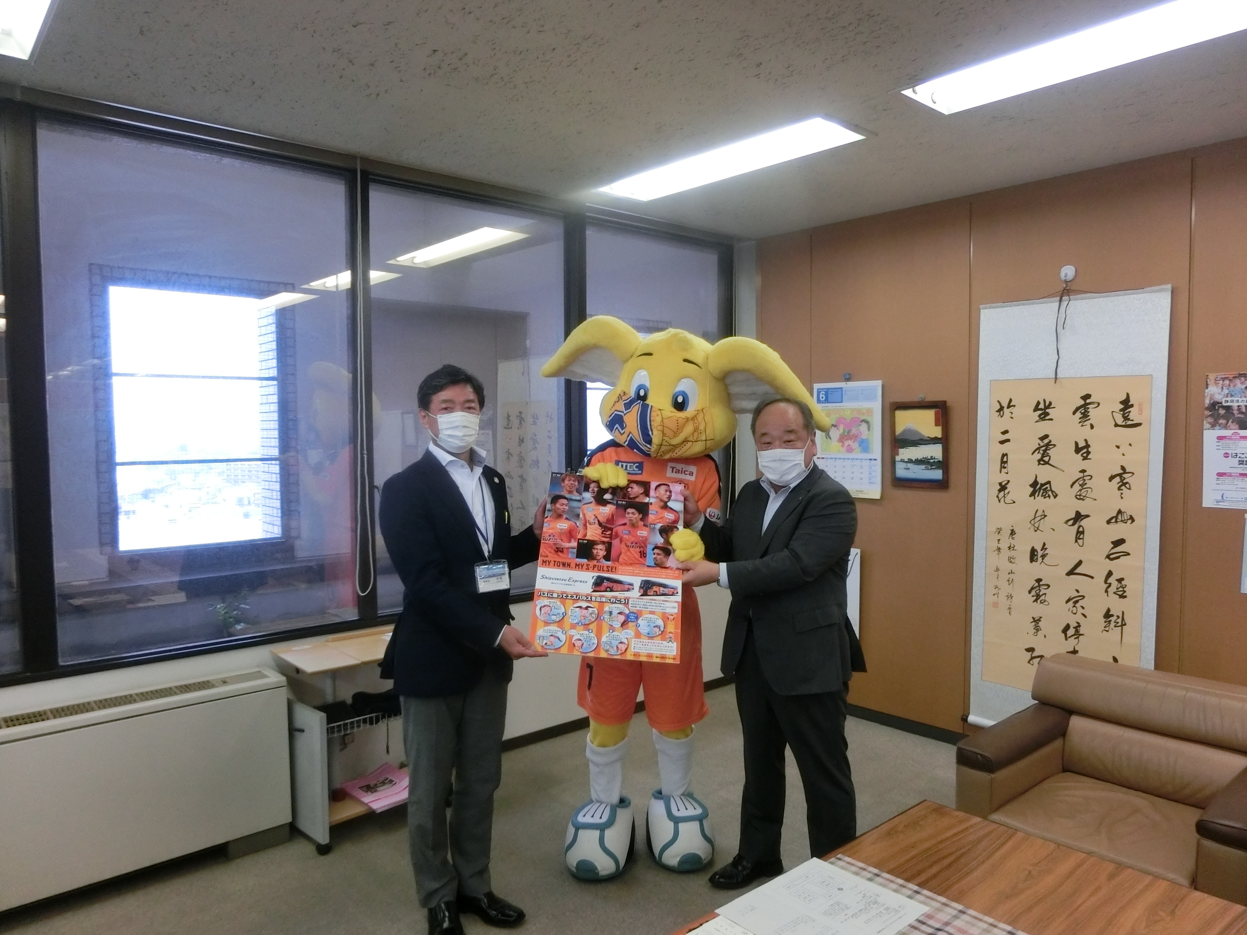 三浦社長とパルちゃんが赤堀教育長へ贈呈 ©︎︎︎S-PULSE