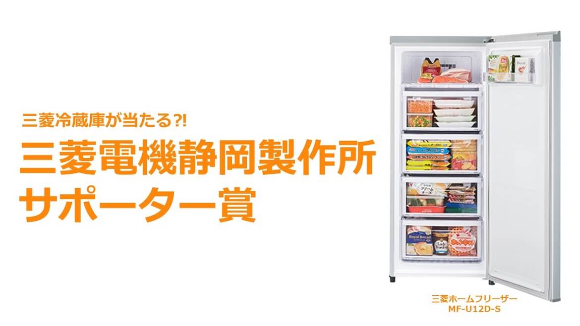 清水エスパルスvs.大分トリニータ@ IAIスタジアム日本平【賞品】 三菱ホームフリーザー MF-U12D-S 【応募方法】 どなたでもご応募いただけます。こちら よりご応募ください。 【応募締切】 試合キックオフまで 【当選告知】 試合終了後、場内大型ビジョンにて発表。また『当選メール』を送信します。 【賞品発送】 『当選メール』が届いたら、必要事項をご記入いただきメールを返信してください。後日賞品を発送いたします。