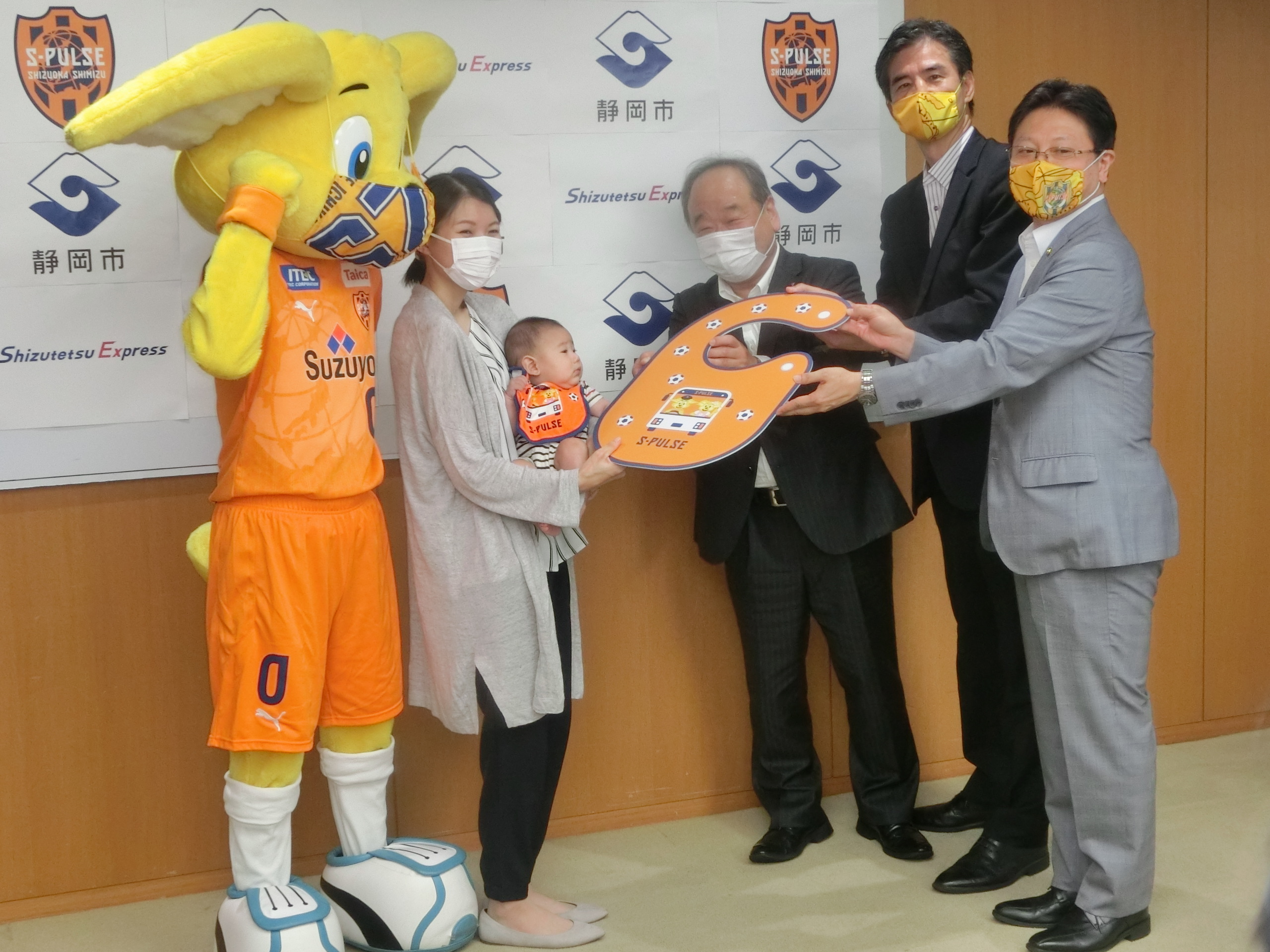 今年度は、7月17日(金)、静岡市役所静岡庁舎にて贈呈式を行いました。贈呈式には、田辺信宏静岡市長、当事業にご賛同いただきました、しずてつジャストライン株式会社 代表取締役社長 三浦孝文様、専務取締役 風間直幸様、㈱エスパルス 代表取締役社長山室晋也、オフィシャルマスコットパルちゃん、市民代表岩下彩加様、朔也ちゃんにご出席いただきました。