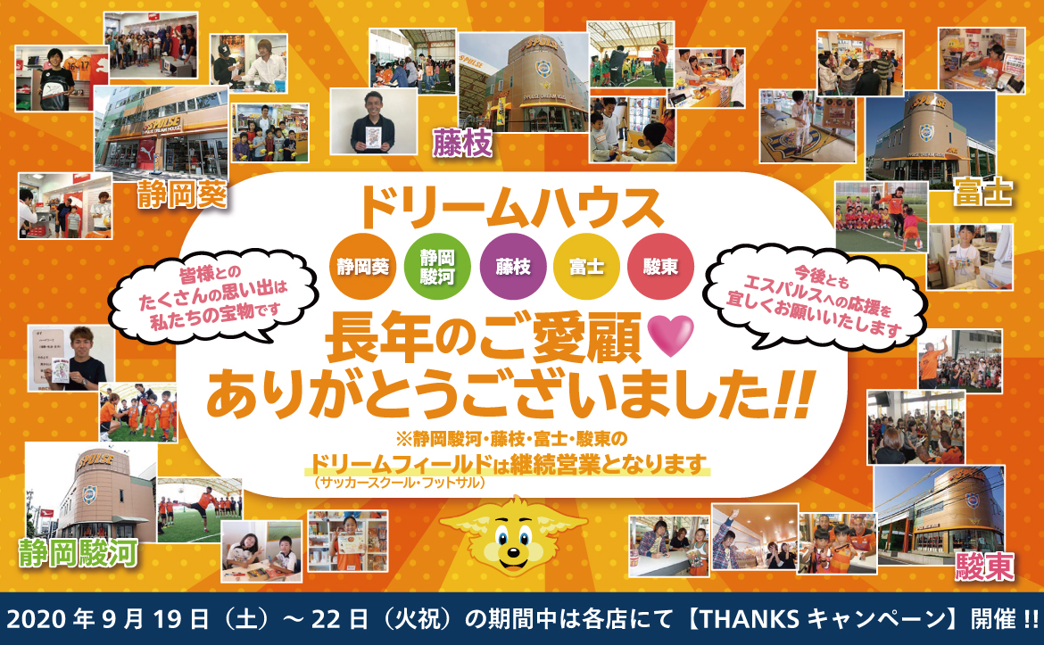 エスパルスはこのたび、オフィシャルショップ「エスパルスドリームハウス(SDH)静岡葵/静岡駿河/藤枝/駿東/富士」の5店舗を、誠に勝手ながら2020年9月23日(水)をもちまして、閉店させていただくこととなりました。これまで地域の皆様に長きにわたりご愛顧いただきましたことを、あらためまして厚く御礼申し上げます。
